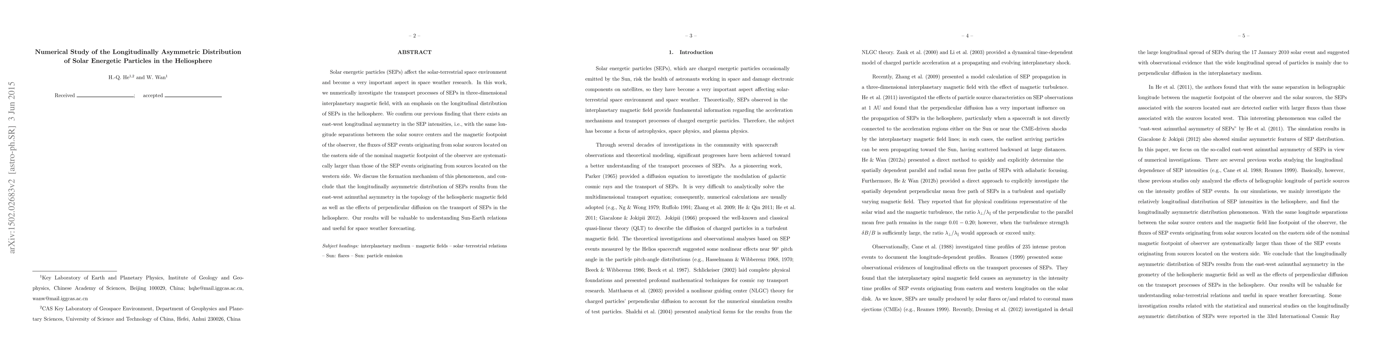 This paper numerically investigates the transport of solar energetic particles (SEPs) in the heliosphere, confirming an east-west asymmetry in SEP intensities due to the heliospheric magnetic field's topology and perpendicular diffusion. The findings enhance understanding of Sun-Earth connections and improve space weather forecasting.