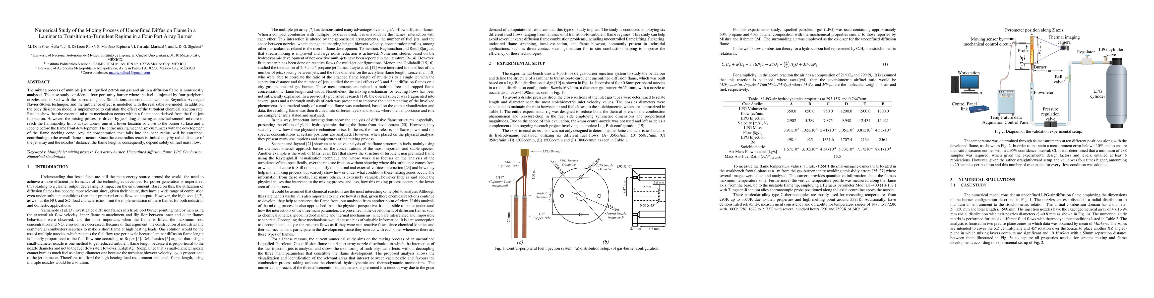 The mixing process of multiple jets of liquefied petroleum gas and air in a diffusion flame is numerically analysed. The case study considers a four-port array burner where the fuel is injected by four peripheral nozzles and mixed with the surrounding air. Simulations are conducted with the Reynolds-Averaged Navier-Stokes technique, and the turbulence effect is modelled with the realizable k-e model. In addition, the eddy dissipation model is implemented to calculate the effect of the turbulent chemical reaction rate. Results show that the essential mixture mechanism occurs within a flame cone derived from the fuel jets interaction. However, the mixing process is driven by jets drag allowing an air/fuel smooth mixture to reach the flammability limits at two zones: one at a lower location or close to the burner surface and a second before the flame front development. The entire mixing mechanism culminates with the development of the flame necking cone. Any air concentration that falls into the cone radius will be entrained, contributing to the overall flame structure. Since the cone radius reach is limited only by radial distance of the jet array and the nozzles distance, the flame heights, consequently, depend solely on fuel mass flow.