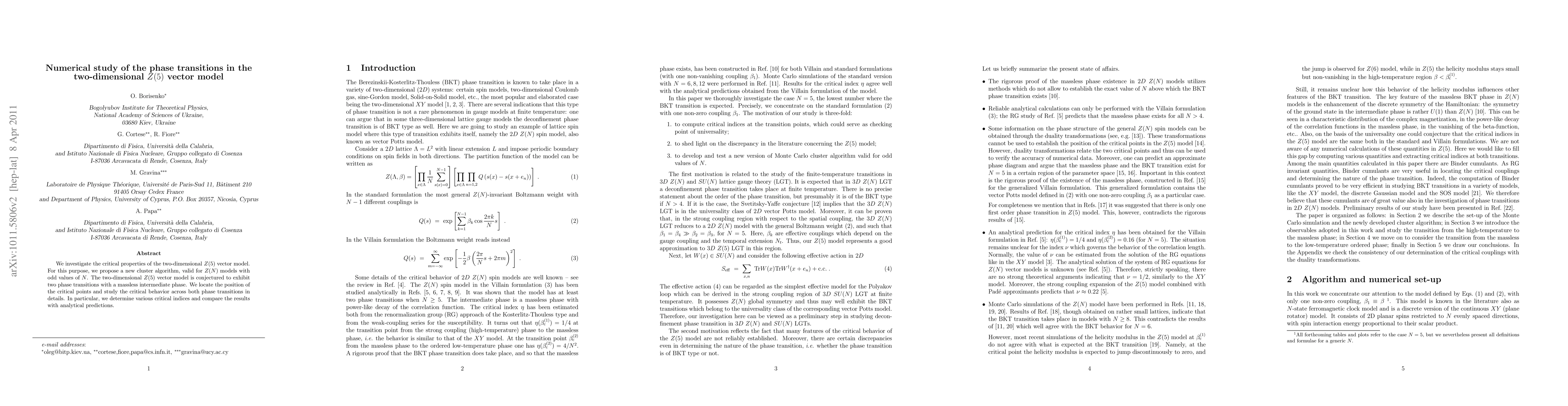 We investigate the critical properties of the two-dimensional Z(5) vector model. For this purpose, we propose a new cluster algorithm, valid for Z(N) models with odd values of N. The two-dimensional Z(5) vector model is conjectured to exhibit two phase transitions with a massless intermediate phase. We locate the position of the critical points and study the critical behavior across both phase transitions in details. In particular, we determine various critical indices and compare the results with analytical predictions.