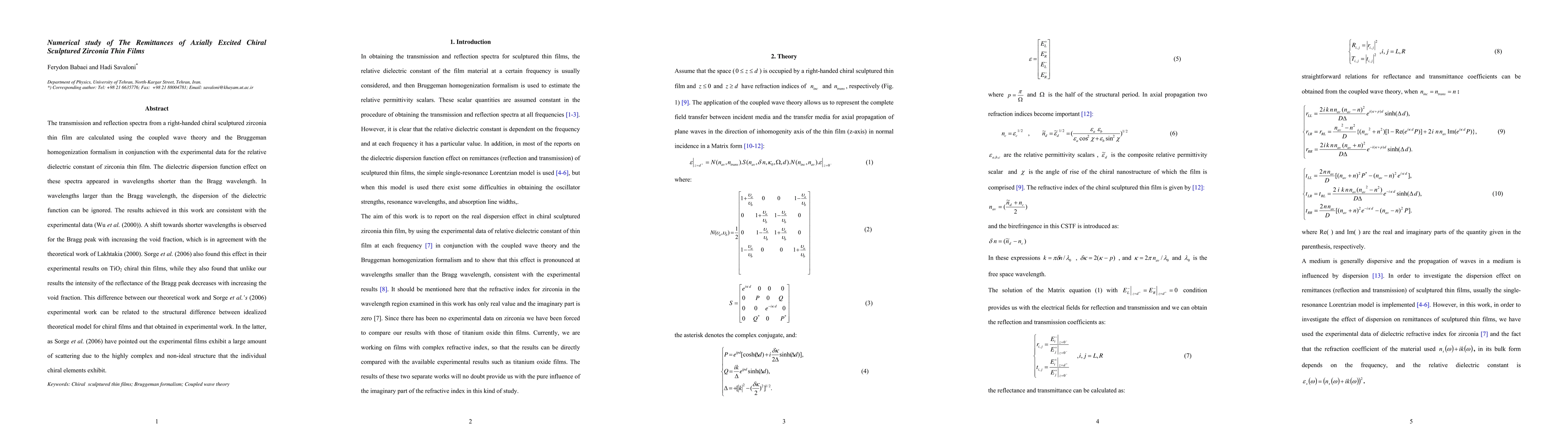 This paper numerically investigates the optical properties of chiral sculptured zirconia thin films using coupled wave theory and Bruggeman homogenization, finding that dielectric dispersion affects spectra at wavelengths shorter than the Bragg wavelength. The study aligns with experimental data and theoretical observations, noting discrepancies in reflectance intensity with experimental results due to structural differences.