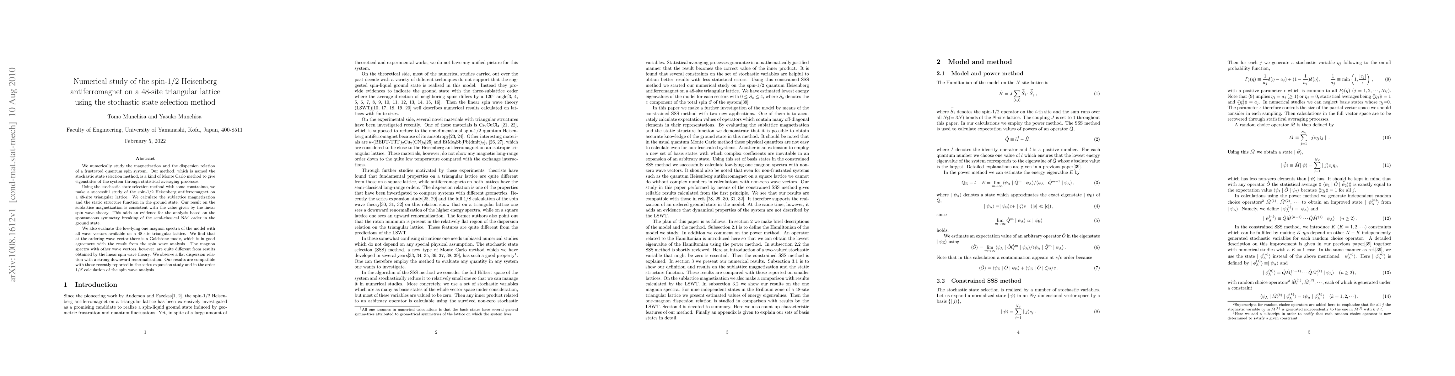 We numerically study the magnetization and the dispersion relation of a frustrated quantum spin system. Our method, which is named the stochastic state selection method, is a kind of Monte Carlo method to give eigenstates of the system through statistical averaging processes. Using the stochastic state selection method with some constraints, we make a successful study of the spin-1/2 Heisenberg antiferromagnet on a 48-site triangular lattice. We calculate the sublattice magnetization and the static structure function in the ground state. Our result on the sublattice magnetization is consistent with the value given by the linear spin wave theory. This adds an evidence for the analysis based on the spontaneous symmetry breaking of the semi-classical Neel order in the ground state. We also evaluate the low-lying one magnon spectra of the model with all wave vectors available on a 48-site triangular lattice. We find that at the ordering wave vector there is a Goldstone mode, which is in good agreement with the result from the spin wave analysis. The magnon spectra with other wave vectors, however, are quite different from results obtained by the linear spin wave theory. We observe a flat dispersion relation with a strong downward renormalization. Our results are compatible with those recently reported in the series expansion study and in the order 1/S calculation of the spin wave analysis.