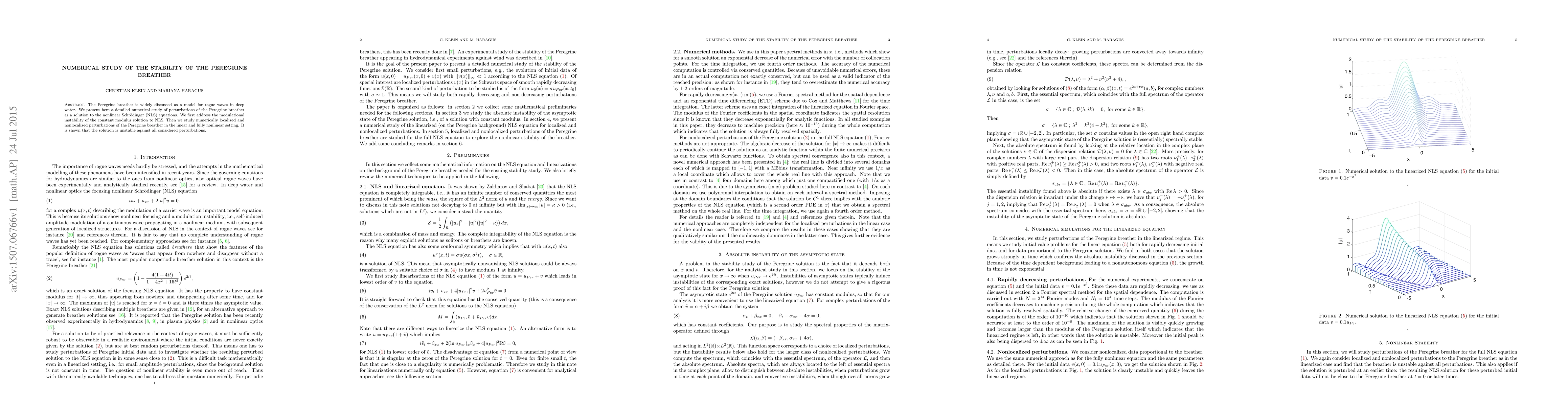 This paper conducts a numerical study on the stability of the Peregrine breather, a model for rogue waves, revealing its instability against various perturbations in both linear and nonlinear settings. The analysis confirms that the Peregrine breather is prone to modulational instability and cannot withstand localized or nonlocalized perturbations.