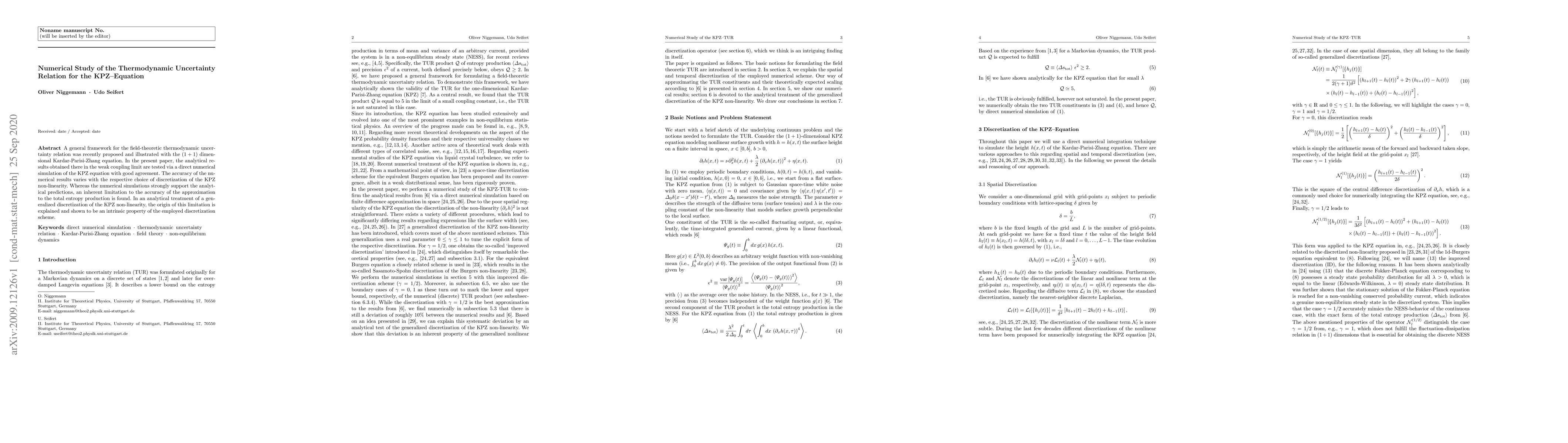 Researchers validated an analytical framework for thermodynamic uncertainty relations in the KPZ equation using numerical simulations, finding strong agreement but also a limitation due to discretization choices.