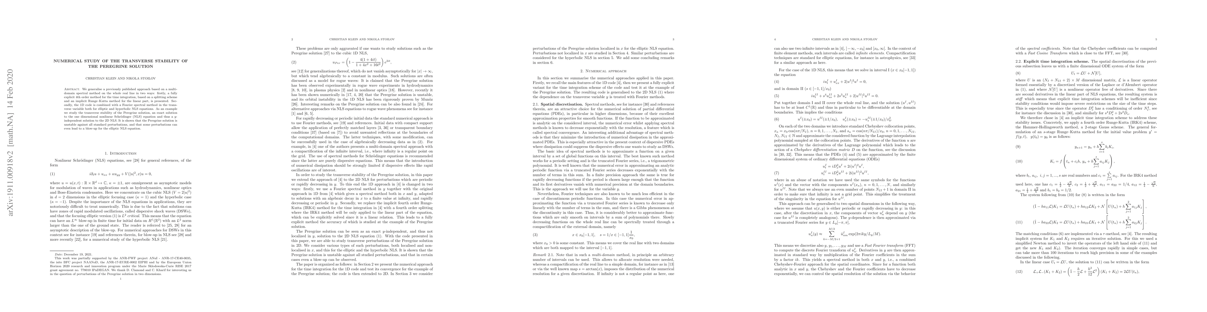 This paper presents a numerical study on the transverse stability of the Peregrine solution, utilizing a multi-domain spectral method and a 4th order time integration scheme. It finds that the Peregrine solution is unstable against standard perturbations, with some leading to blow-up in the elliptic NLS equation.