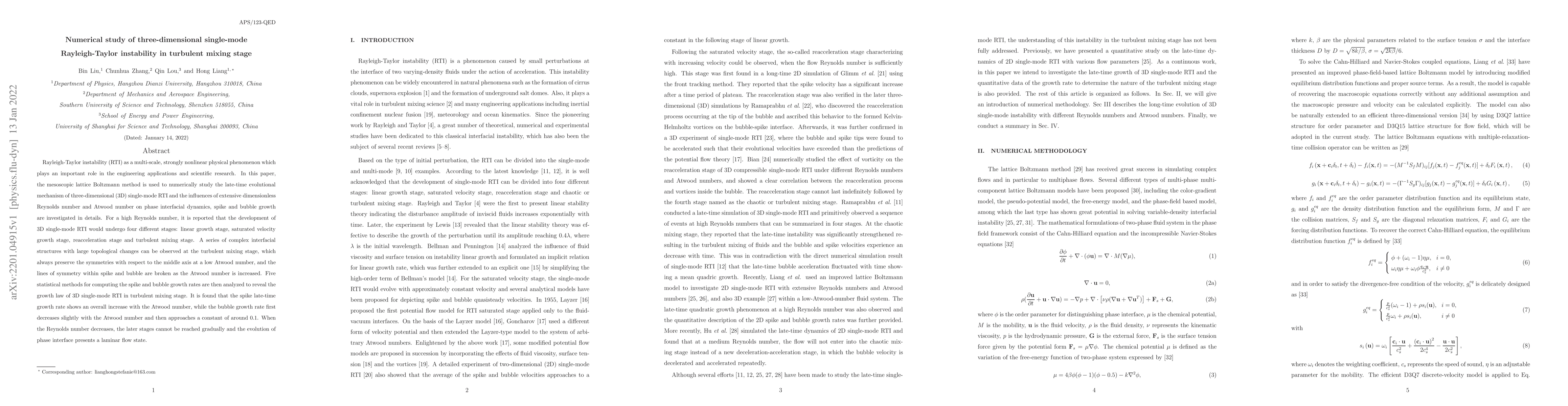 This paper uses the mesoscopic lattice Boltzmann method to numerically investigate the late-time evolution of 3D single-mode Rayleigh-Taylor instability, focusing on the effects of Reynolds and Atwood numbers on interfacial dynamics. The study reveals four stages of RTI development and shows that spike growth increases with the Atwood number, while bubble growth stabilizes at a constant rate.