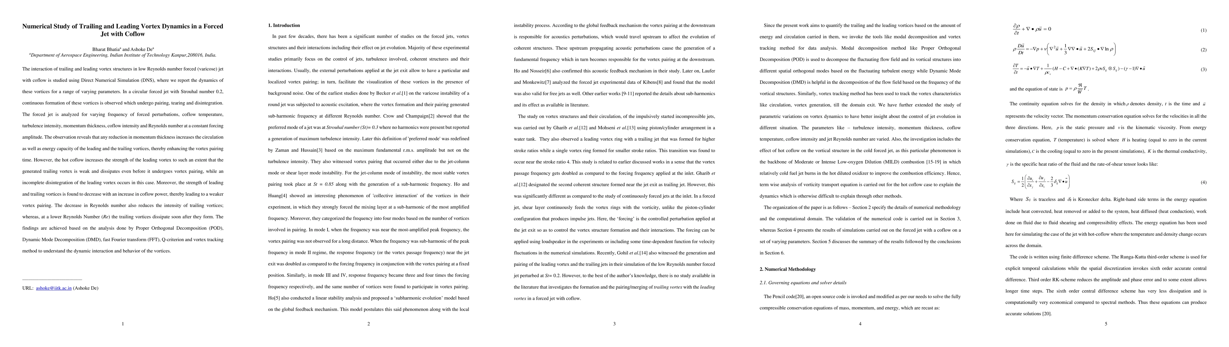 A study using Direct Numerical Simulation found that varying parameters in a forced jet with coflow affect trailing and leading vortex dynamics, including pairing time and vortex strength, which can impact jet behavior.