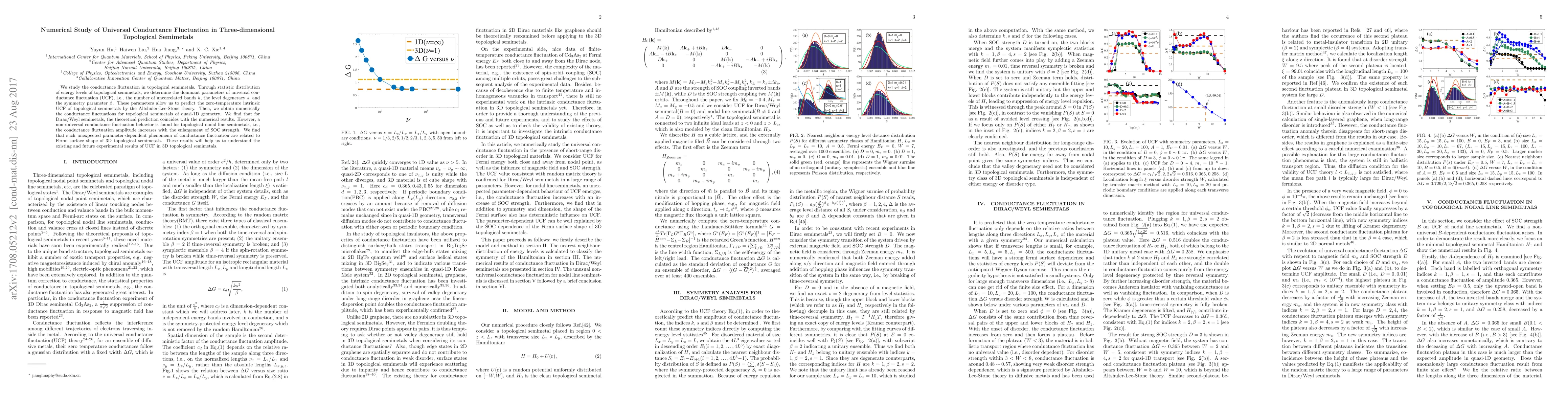 This paper investigates the universal conductance fluctuations (UCF) in three-dimensional topological semimetals, determining key parameters like $k$, $s$, and $\beta$. It finds that while Dirac/Weyl semimetals exhibit predicted UCF behavior, topological nodal line semimetals show a non-universal fluctuation dependent on the strength of spin-orbit coupling, linked to their Fermi surface shape.