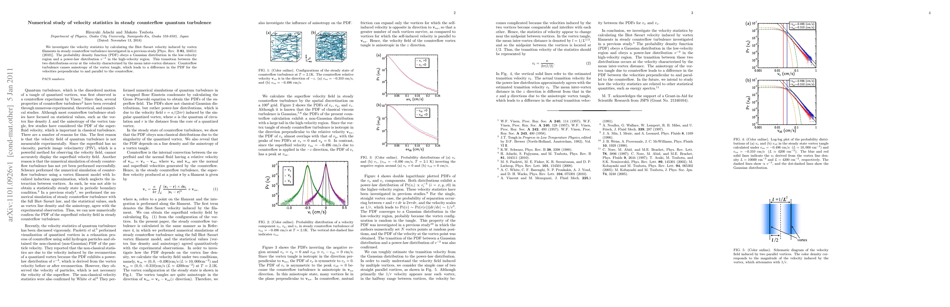 This paper examines the velocity statistics in steady counterflow quantum turbulence, finding that the probability density function follows a Gaussian distribution at low velocities and a power-law distribution at high velocities, with a transition occurring at the mean inter-vortex distance. The anisotropy induced by counterflow turbulence results in distinct probability density functions for velocities perpendicular and parallel to the counterflow.