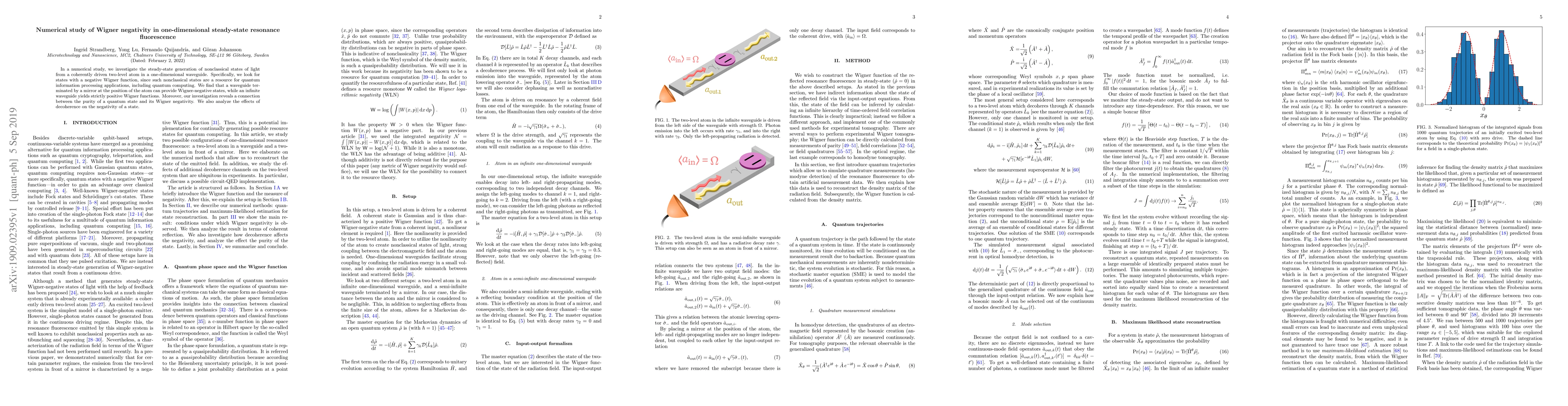 This paper numerically explores the generation of nonclassical light states with negative Wigner functions in a coherently driven two-level atom within a one-dimensional waveguide. It finds that a mirrored waveguide can produce Wigner-negative states, contrasting with infinite waveguides that yield strictly positive Wigner functions, and highlights a link between quantum state purity and Wigner negativity, along with the impact of decoherence.