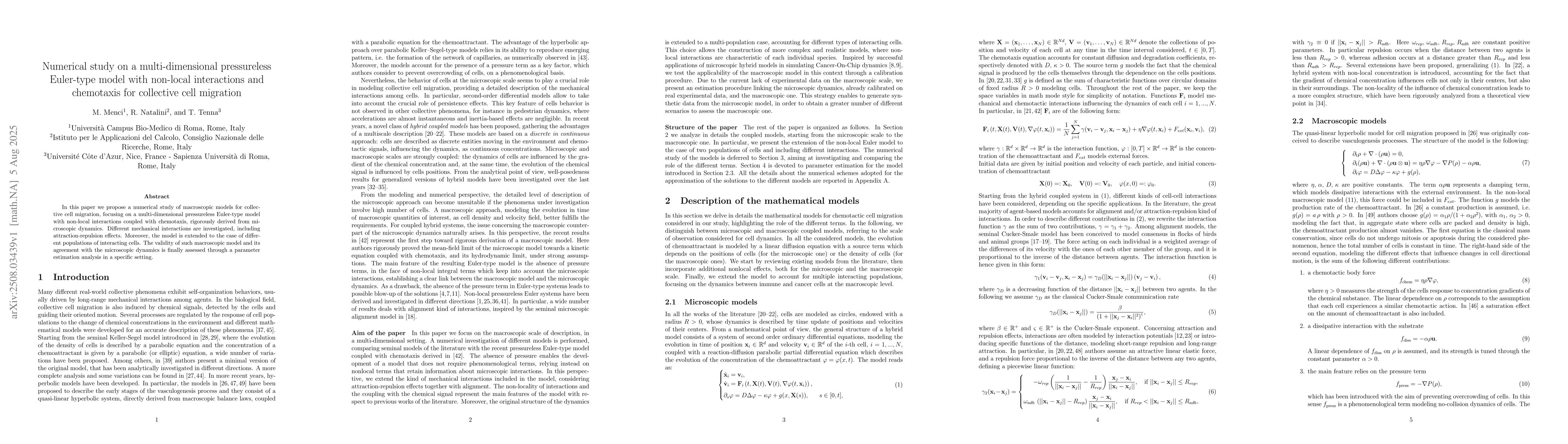 In this paper we propose a numerical study of macroscopic models for collective cell migration, focusing on a multi-dimensional pressureless Euler-type model with non-local interactions coupled with chemotaxis, rigorously derived from microscopic dynamics. Different mechanical interactions are investigated, including attraction-repulsion effects. Moreover, the model is extended to the case of different populations of interacting cells. The validity of such macroscopic model and its agreement with the microscopic dynamics is finally assessed through a parameter estimation analysis in a specific setting.