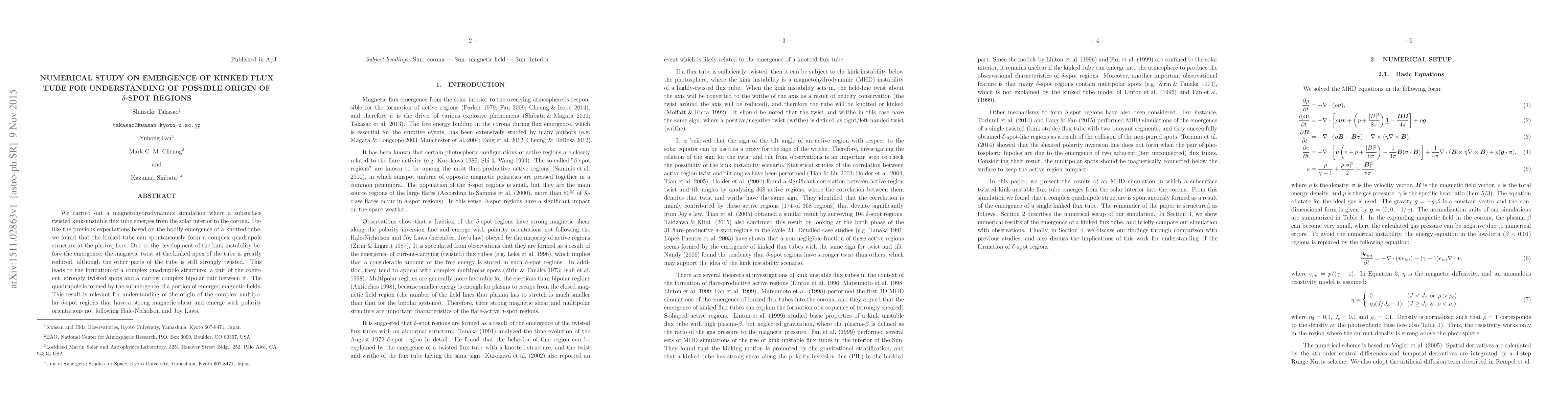 This study uses magnetohydrodynamics simulations to show that a subsurface twisted kink-unstable flux tube can spontaneously form a complex quadrupole structure at the photosphere, leading to the formation of $\delta$-spot regions with strong magnetic shear. The kink instability reduces twist at the apex, contributing to the unique quadrupole configuration.