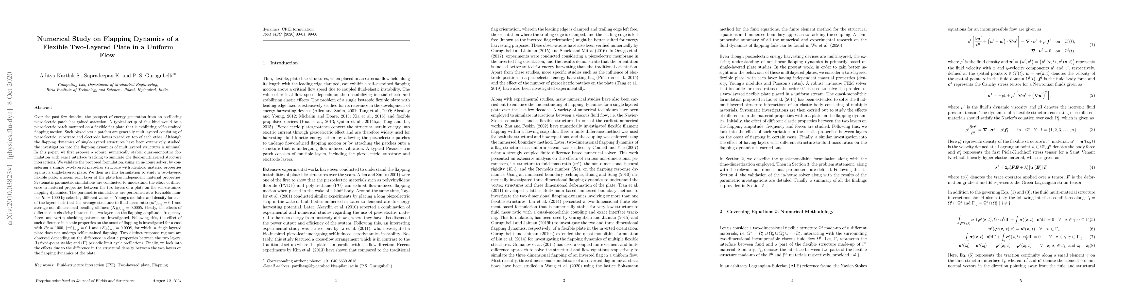 Over the past few decades, the prospect of energy generation from an oscillating piezoelectric patch has gained attention. A typical setup of this kind would be a piezoelectric patch mounted on a flexible plate that is exhibiting self-sustained flapping motion. Piezoelectric patches are generally multilayered consisting of piezoelectric, substrate and electrode layers placed on top of each other. In this paper, we first propose a quasi-monolithic formulation with exact interface tracking to simulate the fluid-multilayered structure interactions. We validate the proposed formulation, using an in-house solver, by considering a simple two-layered plate-like structure with identical material properties against a single-layered plate. We then use this formulation to study a two-layered flexible plate, wherein each layer of the plate has independent material properties. Systematic parametric simulations are conducted to understand the effect of difference in material properties between the two layers of a plate on the self-sustained flapping dynamics. The parametric simulations are performed at a Reynolds number Re=1000 by selecting different values of Young's modulus and density for each of the layers such that the average structure to fluid mass ratio (m)avg=0.1 and average non-dimensional bending stiffness (KB)avg=0.0005. Firstly, the effects of difference in elasticity between the two layers on the flapping amplitude, frequency, forces and vortex shedding patterns are investigated. Following this, the effect of such difference in elastic properties on the onset of flapping is investigated for a case with Re=1000, (m)avg=0.1 and (KB)avg=0.0008 and two distinct response regimes are observed: (a) fixed-point stable and (b) periodic LCO. Finally, we look into the effects due to the difference in the structural density between the two layers on the flapping dynamics of the plate.