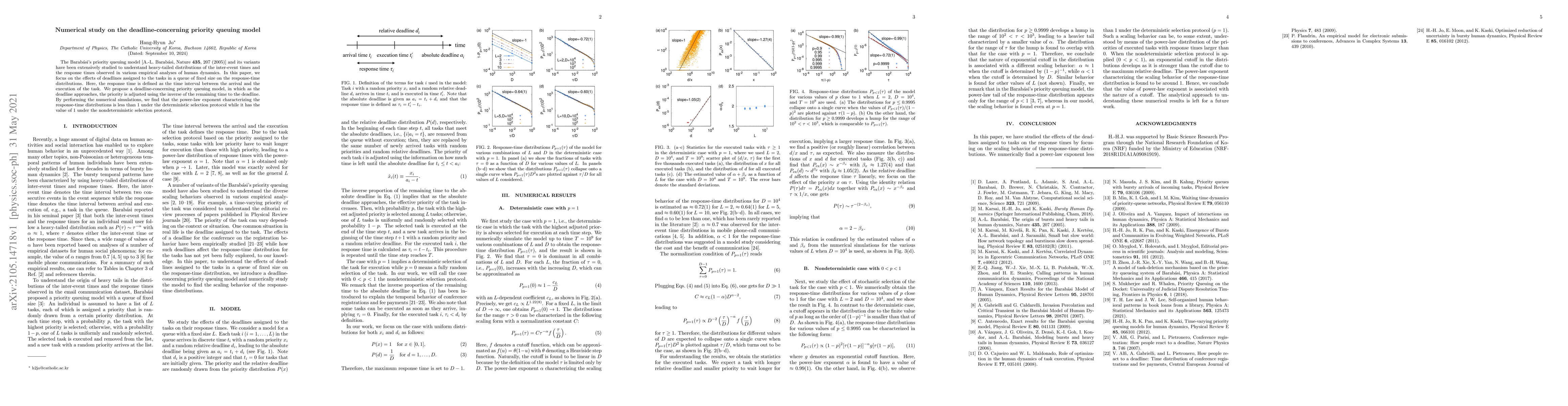 This paper investigates a deadline-concerning priority queuing model where task priority is adjusted based on remaining time to the deadline. Numerical simulations reveal that the power-law exponent for response times is less than $1$ under deterministic selection, contrasting with a value of $1$ under nondeterministic selection.