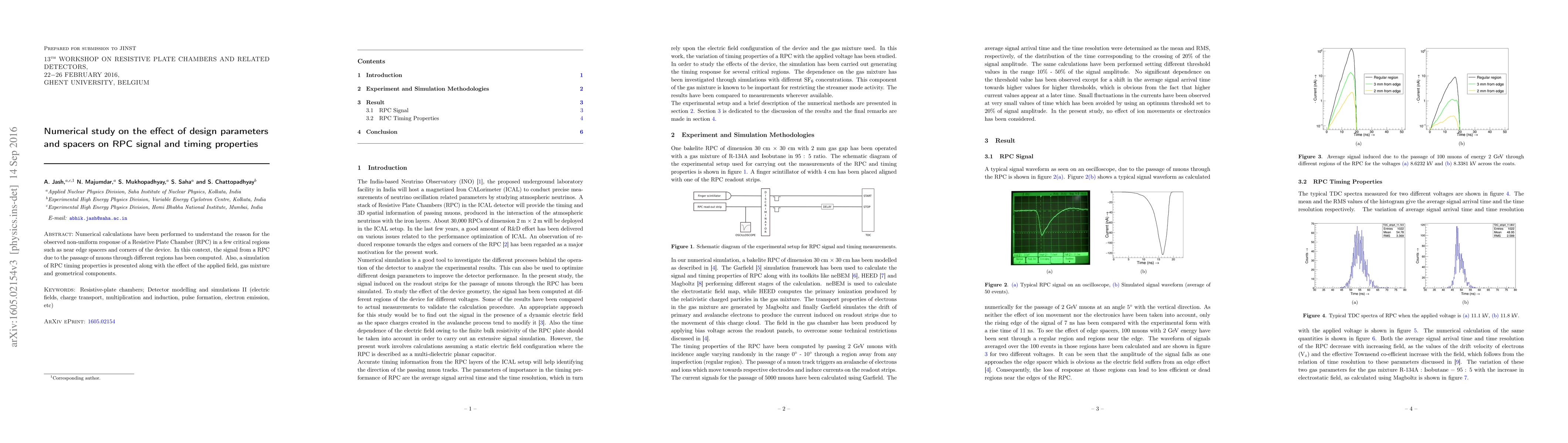 Numerical calculations have been performed to understand the reason for the observed non-uniform response of a Resistive Plate Chamber (RPC) in a few critical regions such as near edge spacers and corners of the device. In this context, the signal from a RPC due to the passage of muons through different regions has been computed. Also, a simulation of RPC timing properties is presented along with the effect of the applied field, gas mixture and geometrical components.