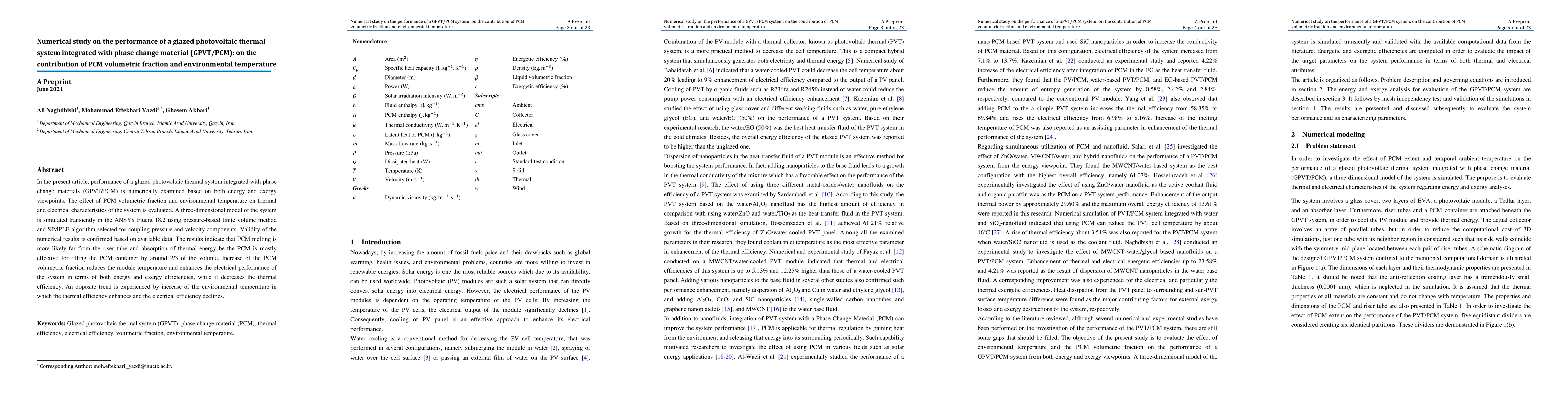 This paper numerically investigates the performance of a glazed photovoltaic thermal system integrated with phase change material (GPVT/PCM), focusing on the impact of PCM volumetric fraction and environmental temperature on the system's thermal and electrical characteristics. Results show that optimal PCM filling (around 2/3 volume) enhances electrical performance while reducing module temperature, whereas higher environmental temperatures boost thermal efficiency but decrease electrical efficiency.