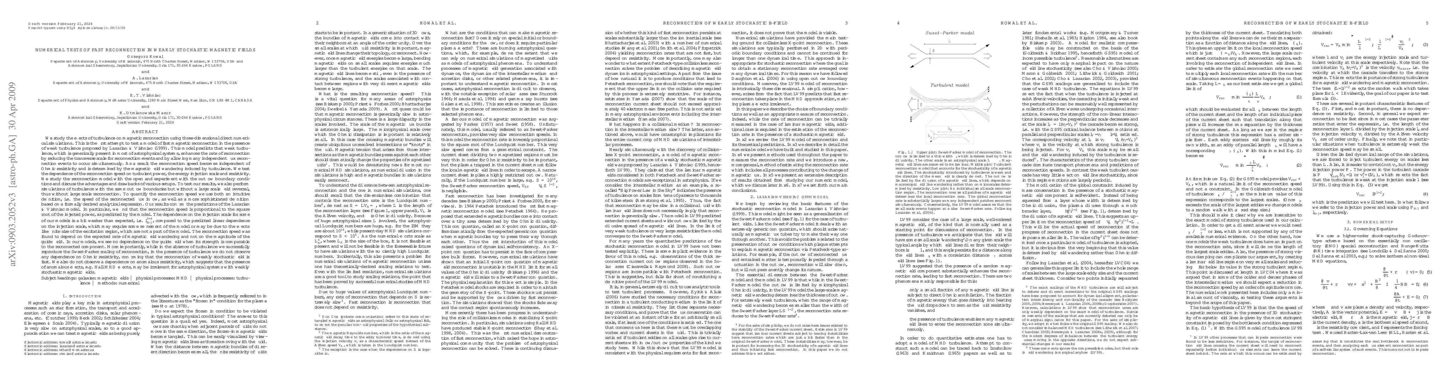This study uses 3D numerical simulations to test the Lazarian & Vishniac model of fast magnetic reconnection in weakly stochastic magnetic fields, confirming that turbulence enhances reconnection speed independent of Ohmic resistivity. The reconnection speed follows Vrec ∝ Pinj^(1/2), though the dependence on the injection scale is slightly weaker than predicted.