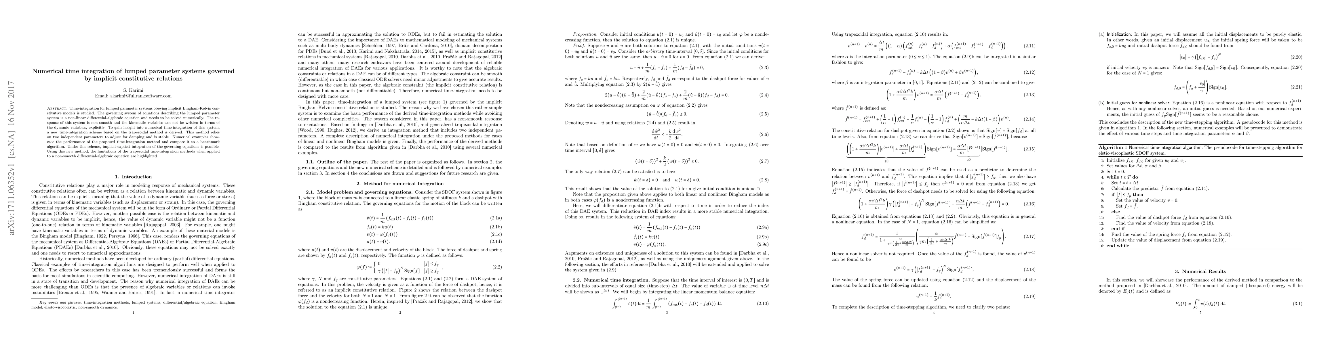 Time-integration for lumped parameter systems obeying implicit Bingham-Kelvin constitutive models is studied. The governing system of equations describing the lumped parameter system is a non-linear differential-algebraic equation and needs to be solved numerically. The response of this system is non-smooth and the kinematic variables can not be written in terms of the dynamic variables, explicitly. To gain insight into numerical time-integration of this system, a new time-integration scheme based on the trapezoidal method is derived. This method relies on two independent parameters to adjust for damping and is stable. Numerical examples showcase the performance of the proposed time-integration method and compare it to a benchmark algorithm. Under this scheme, implicit-explicit integration of the governing equations is possible. Using this new method, the limitations of the trapezoidal time-integration methods when applied to a non-smooth differential-algebraic equation are highlighted.