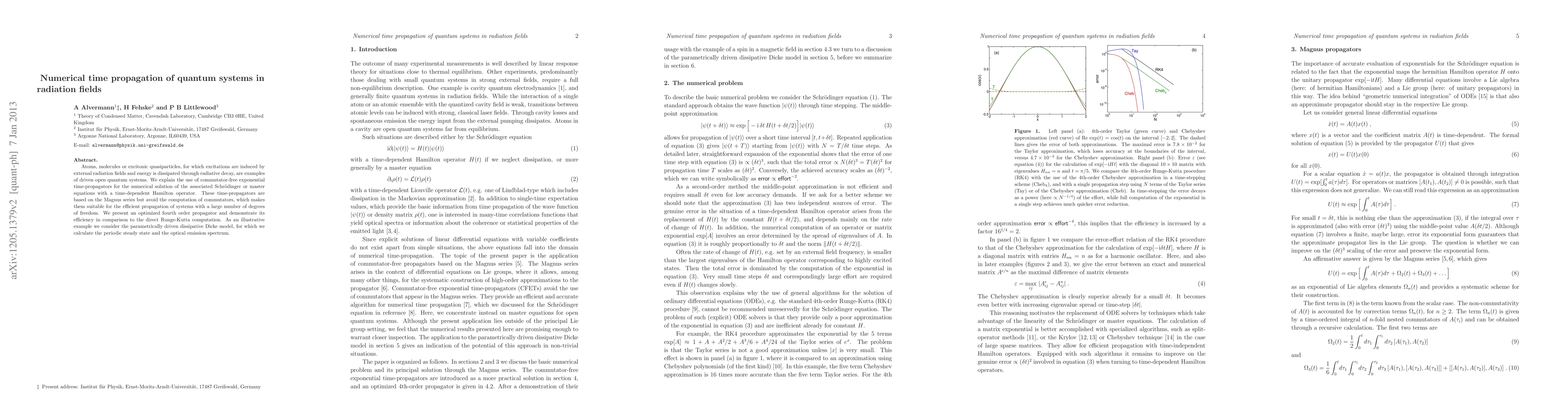 Atoms, molecules or excitonic quasiparticles, for which excitations are induced by external radiation fields and energy is dissipated through radiative decay, are examples of driven open quantum systems. We explain the use of commutator-free exponential time-propagators for the numerical solution of the associated Schr\"odinger or master equations with a time-dependent Hamilton operator. These time-propagators are based on the Magnus series but avoid the computation of commutators, which makes them suitable for the efficient propagation of systems with a large number of degrees of freedom. We present an optimized fourth order propagator and demonstrate its efficiency in comparison to the direct Runge-Kutta computation. As an illustrative example we consider the parametrically driven dissipative Dicke model, for which we calculate the periodic steady state and the optical emission spectrum.