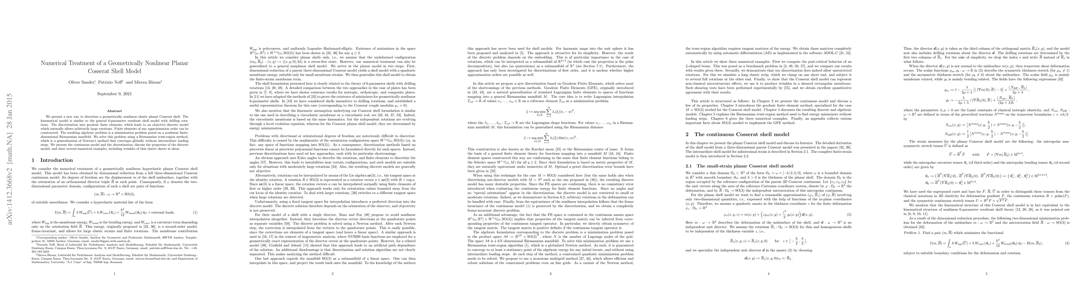 This paper introduces a novel discretization method for geometrically nonlinear planar Cosserat shell models using geodesic finite elements, allowing for large rotations. The method is solved using a Riemannian trust-region method, ensuring global convergence, and demonstrated through numerical examples of thin elastic sheets.