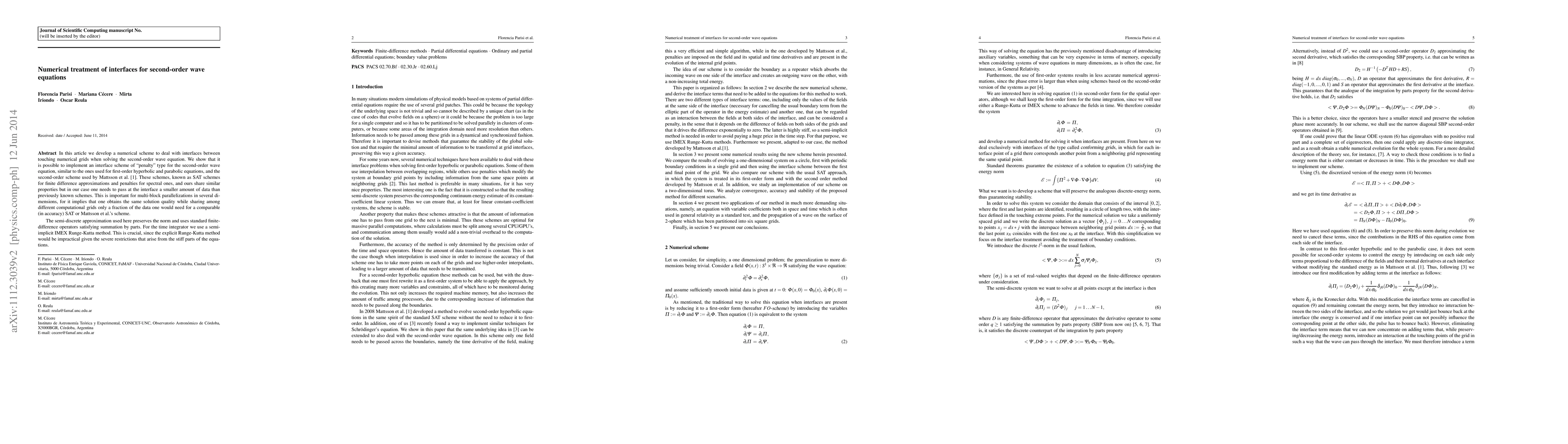 This paper develops a numerical scheme to solve second-order wave equations at grid interfaces, employing a penalty-type approach that requires less data sharing than existing SAT schemes. It uses a semi-implicit IMEX Runge-Kutta method for time integration, suitable for handling the stiff parts of the equations.