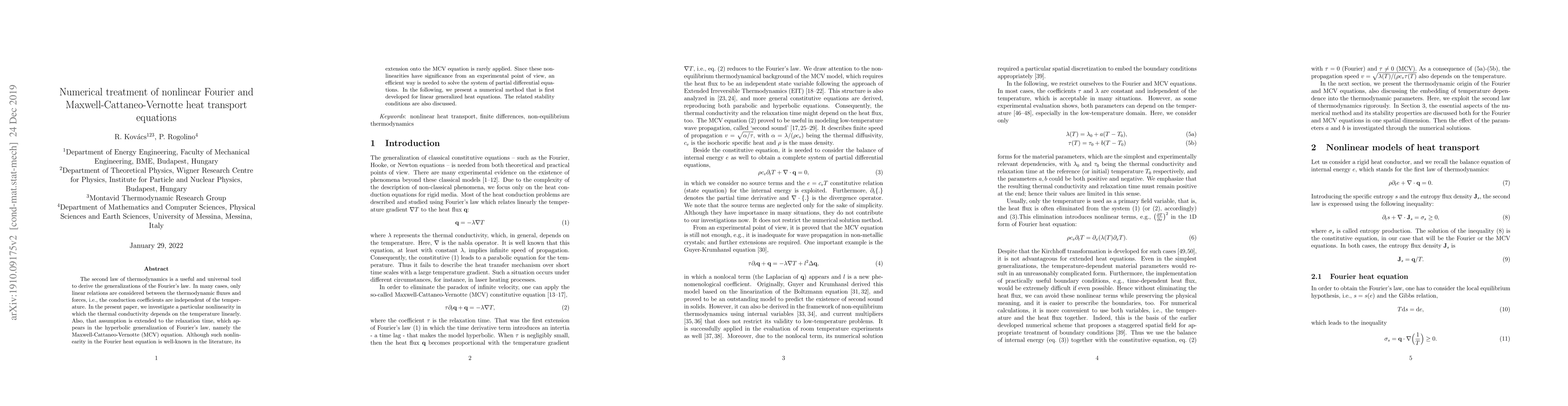 This paper explores the numerical treatment of nonlinear versions of the Fourier and Maxwell-Cattaneo-Vernotte heat transport equations, focusing on thermal conductivity and relaxation time dependencies on temperature. It introduces a numerical method for solving these nonlinear partial differential equations, along with a discussion of related stability conditions.