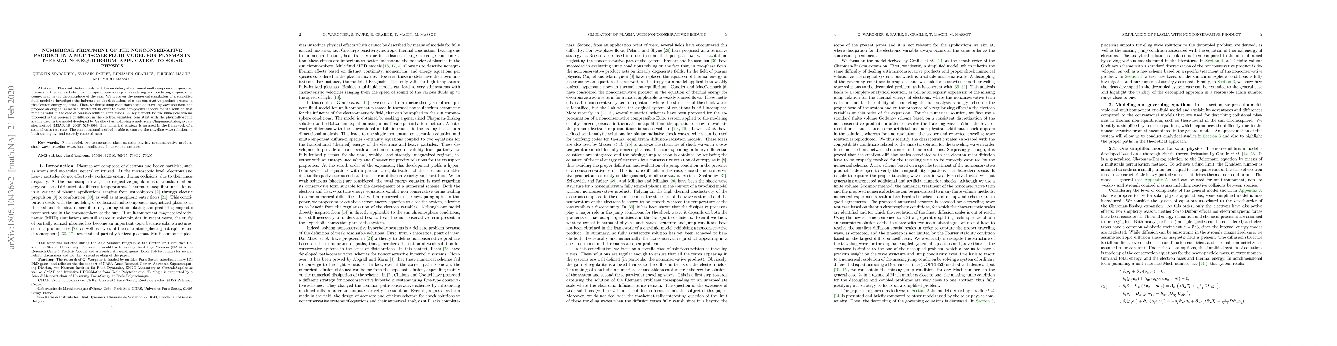 This contribution deals with the modeling of collisional multicomponent magnetized plasmas in thermal and chemical nonequilibrium aiming at simulating and predicting magnetic reconnections in the chromosphere of the sun. We focus on the numerical simulation of a simplified fluid model in order to properly investigate the influence on shock solutions of a nonconservative product present in the electron energy equation. Then, we derive jump conditions based on travelling wave solutions and propose an original numerical treatment in order to avoid non-physical shocks for the solution, that remains valid in the case of coarse-resolution simulations. A key element for the numerical scheme proposed is the presence of diffusion in the electron variables, consistent with the physically-sound scaling used in the model developed by Graille et al. following a multiscale Chapman-Enskog expansion method [M3AS, 19 (2009) 527--599]. The numerical strategy is eventually assessed in the framework of a solar physics test case. The computational method is able to capture the travelling wave solutions in both the highly- and coarsely-resolved cases.