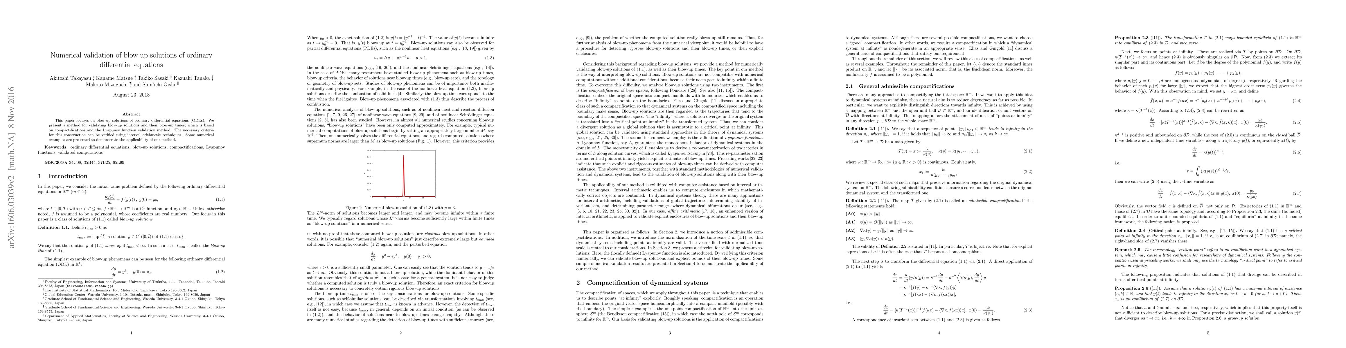 This paper develops a method for validating blow-up solutions and times of ordinary differential equations using compactifications and Lyapunov function validation, verified via interval arithmetic, with numerical examples demonstrating its effectiveness.
