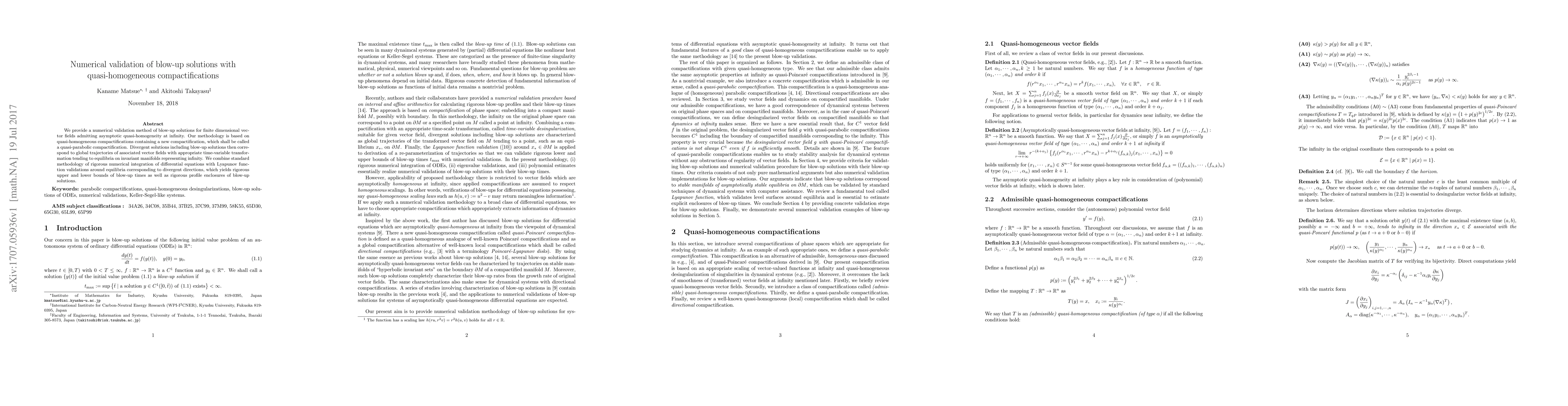 This paper proposes a numerical validation method for blow-up solutions in finite-dimensional vector fields with asymptotic quasi-homogeneity. It utilizes a novel quasi-parabolic compactification and combines rigorous numerical integration with Lyapunov function validations to provide rigorous bounds on blow-up times and profiles.