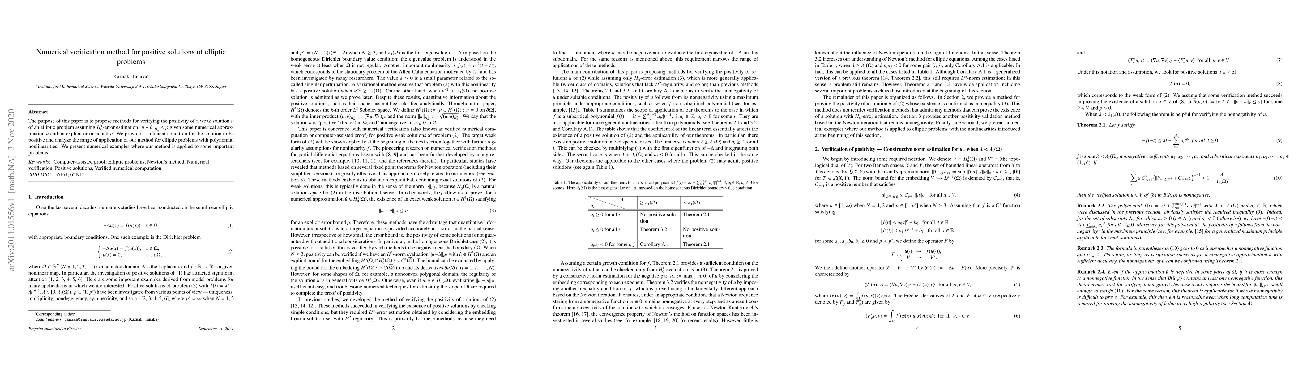 The purpose of this paper is to propose methods for verifying the positivity of a weak solution $ u $ of an elliptic problem assuming $ H^1_0 $-error estimation $ \left\|u-\hat{u}\right\|_{H_{0}^{1}} \leq \rho $ given some numerical approximation $ \hat{u} $ and an explicit error bound $ \rho $. We provide a sufficient condition for the solution to be positive and analyze the range of application of our method for elliptic problems with polynomial nonlinearities. We present numerical examples where our method is applied to some important problems.