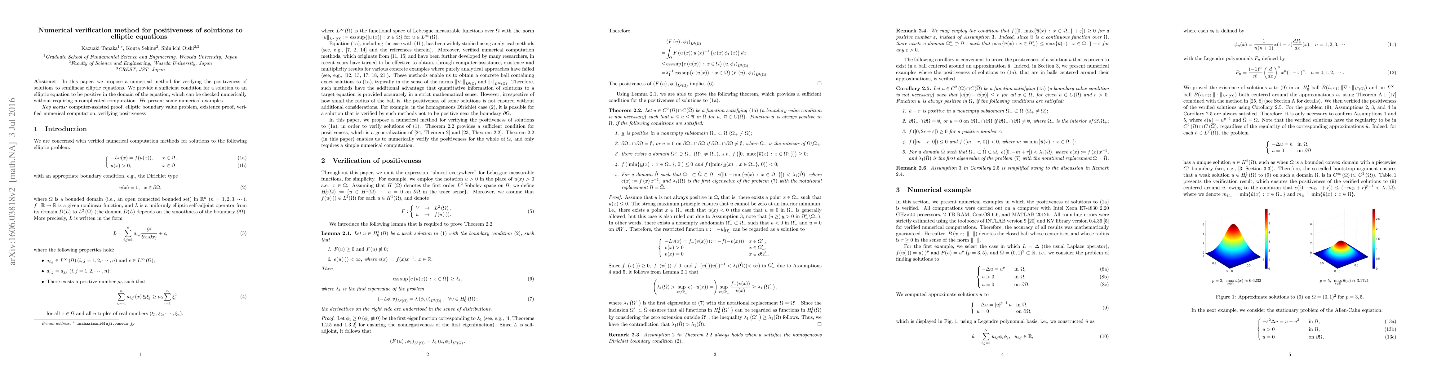 In this paper, we propose a numerical method for verifying the positiveness of solutions to semilinear elliptic equations. We provide a sufficient condition for a solution to an elliptic equation to be positive in the domain of the equation, which can be checked numerically without requiring a complicated computation. We present some numerical examples.