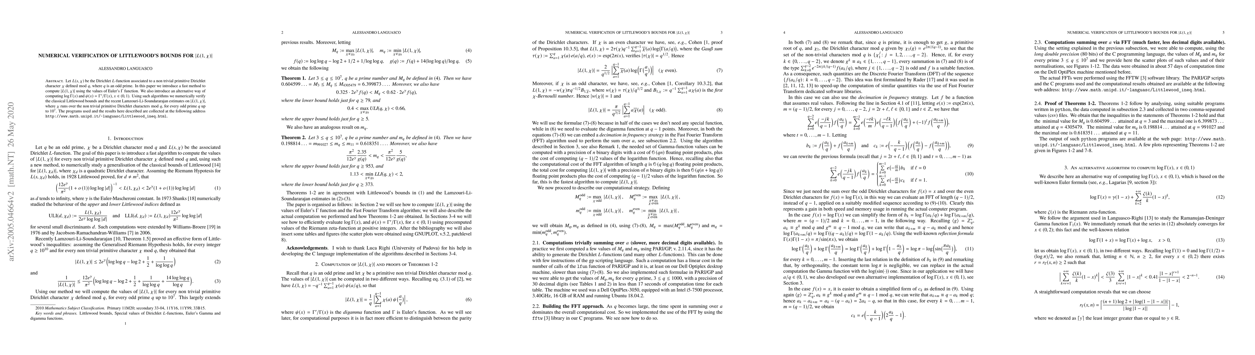 Let $L(s,\chi)$ be the Dirichlet $L$-function associated to a non trivial primitive Dirichlet character $\chi$ defined $\bmod\ q$, where $q$ is an odd prime. In this paper we introduce a fast method to compute $\vert L(1,\chi) \vert$ using the values of Euler's $\Gamma$ function. We also introduce an alternative way of computing $\log \Gamma(x)$ and $\psi(x)= \Gamma^\prime/\Gamma(x)$,$x\in(0,1)$. Using such algorithms we numerically verify the classical Littlewood bounds and the recent Lamzouri-Li-Soundararajan estimates on $\vert L(1,\chi) \vert$, where $\chi$ runs over the non trivial primitive Dirichlet characters $\bmod\ q$, for every odd prime $q$ up to $10^7$. The programs used and the results here described are collected at the following address \url{http://www.math.unipd.it/~languasc/Littlewood_ineq.html}.
