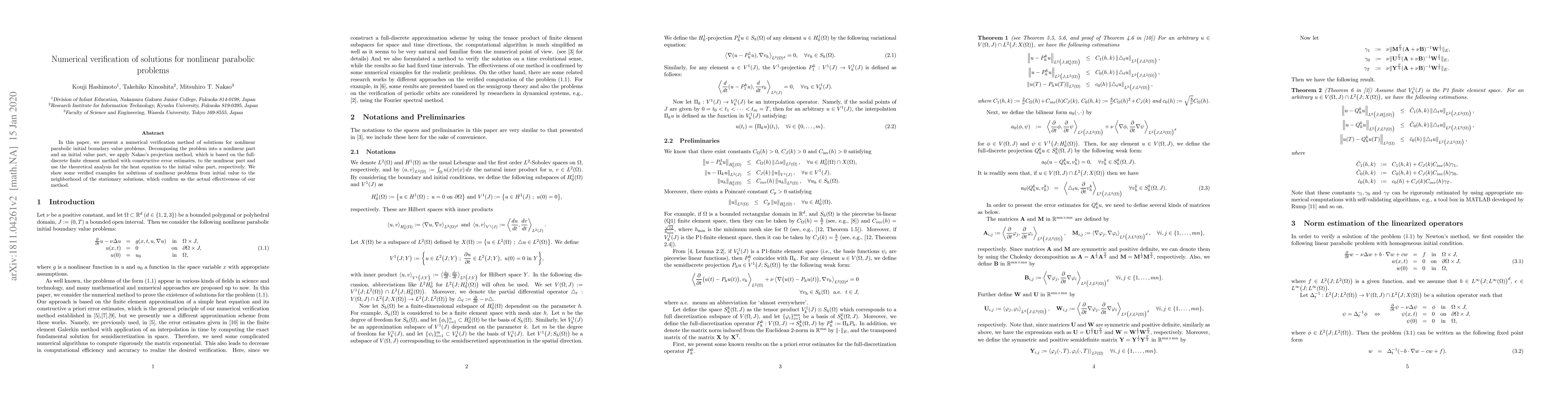 In this paper, we present a numerical verification method of solutions for nonlinear parabolic initial boundary value problems. Decomposing the problem into a nonlinear part and an initial value part, we apply Nakao's projection method, which is based on the full-discrete finite element method with constructive error estimates, to the nonlinear part and use the theoretical analysis for the heat equation to the initial value part, respectively. We show some verified examples for solutions of nonlinear problems from initial value to the neighborhood of the stationary solutions, which confirm us the actual effectiveness of our method.