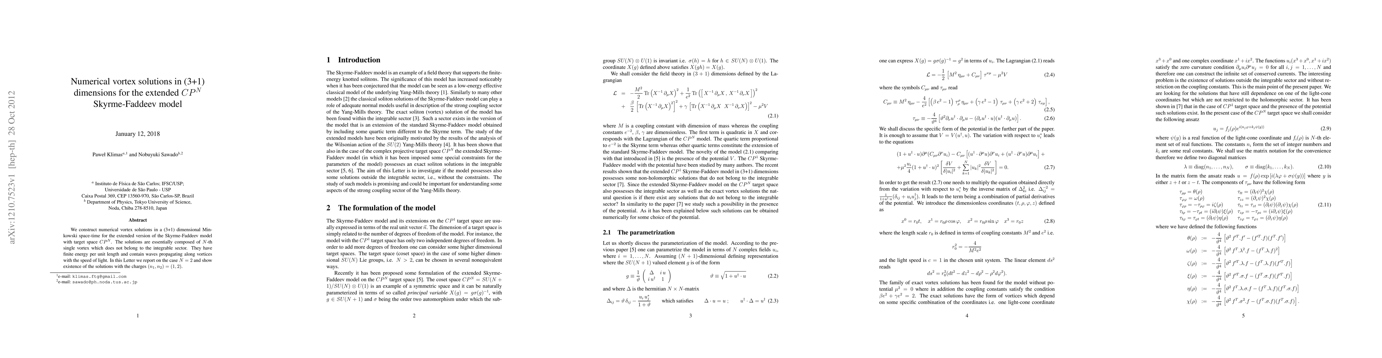 The paper introduces a numerical method for finding vortex solutions in the extended $CP^N$ Skyrme-Faddeev model, demonstrating their finite energy and wave propagation characteristics.