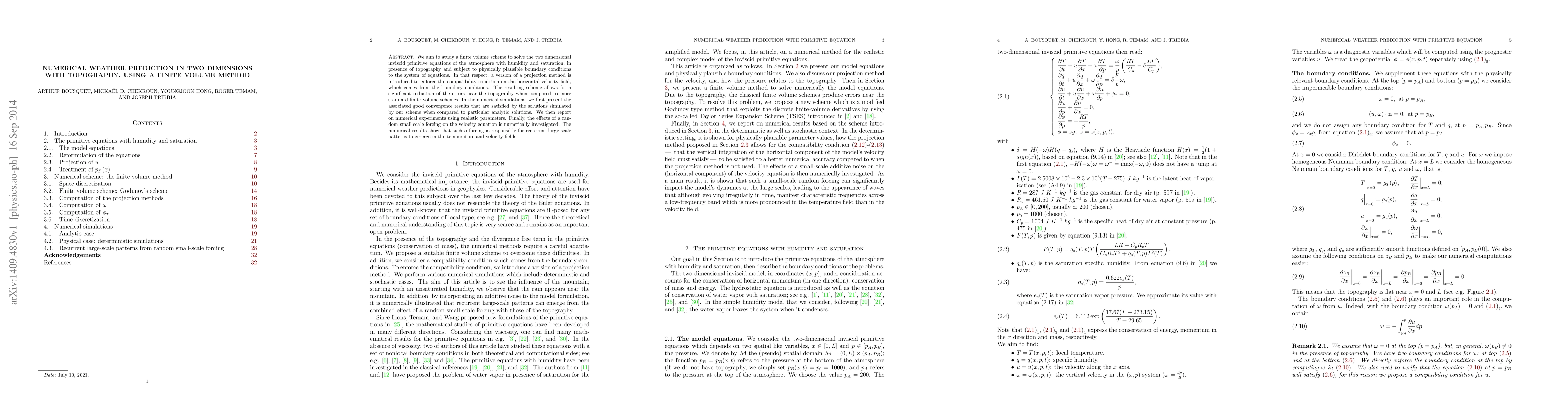 We aim to study a finite volume scheme to solve the two dimensional inviscid primitive equations of the atmosphere with humidity and saturation, in presence of topography and subject to physically plausible boundary conditions to the system of equations. In that respect, a version of a projection method is introduced to enforce the compatibility condition on the horizontal velocity field, which comes from the boundary conditions. The resulting scheme allows for a significant reduction of the errors near the topography when compared to more standard finite volume schemes. In the numerical simulations, we first present the associated good convergence results that are satisfied by the solutions simulated by our scheme when compared to particular analytic solutions. We then report on numerical experiments using realistic parameters. Finally, the effects of a random small-scale forcing on the velocity equation is numerically investigated. The numerical results show that such a forcing is responsible for recurrent large-scale patterns to emerge in the temperature and velocity fields.