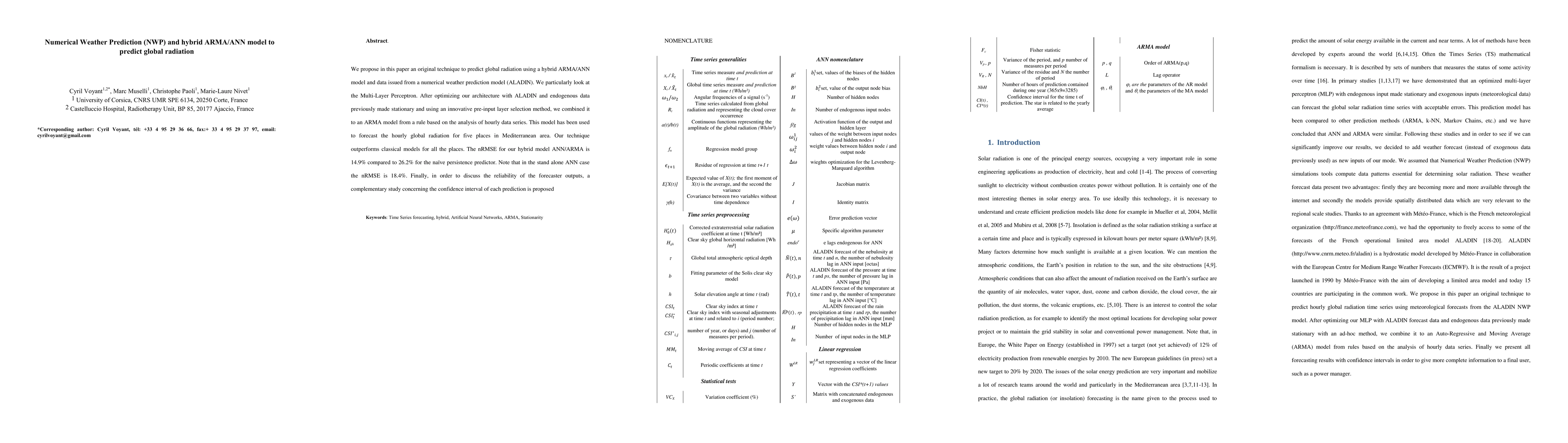 This paper introduces a hybrid ARMA/ANN model for predicting global radiation, combining data from a numerical weather prediction model with a Multi-Layer Perceptron. The hybrid model outperforms classical models, achieving a lower normalized root mean square error (nRMSE) of 14.9% compared to 26.2% for a persistence predictor.