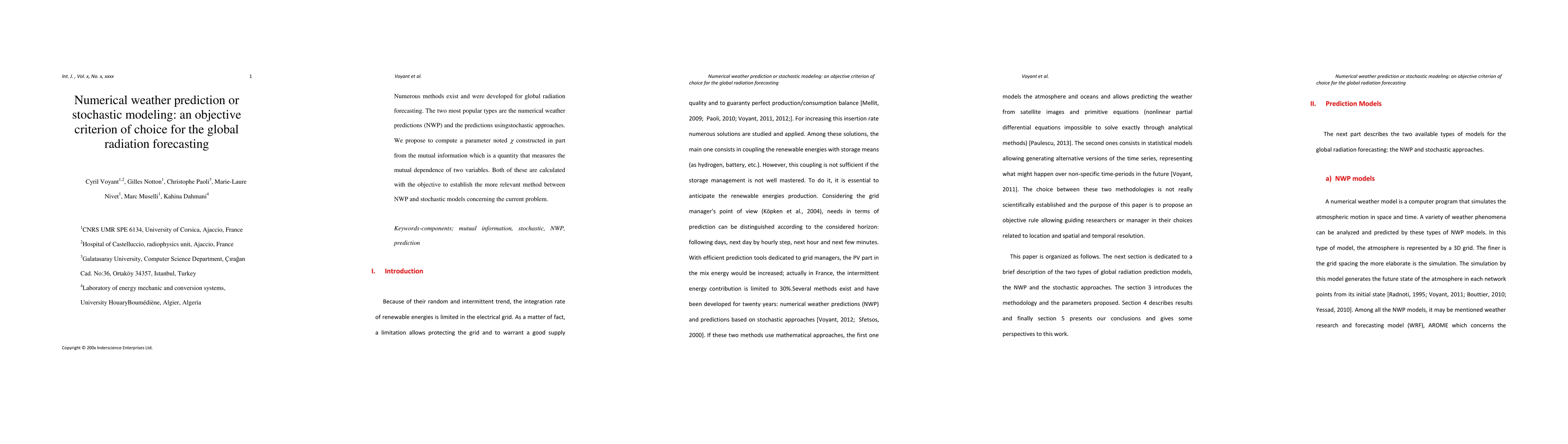 Numerous methods exist and were developed for global radiation forecasting. The two most popular types are the numerical weather predictions (NWP) and the predictions using stochastic approaches. We propose to compute a parameter noted constructed in part from the mutual information which is a quantity that measures the mutual dependence of two variables. Both of these are calculated with the objective to establish the more relevant method between NWP and stochastic models concerning the current problem.
