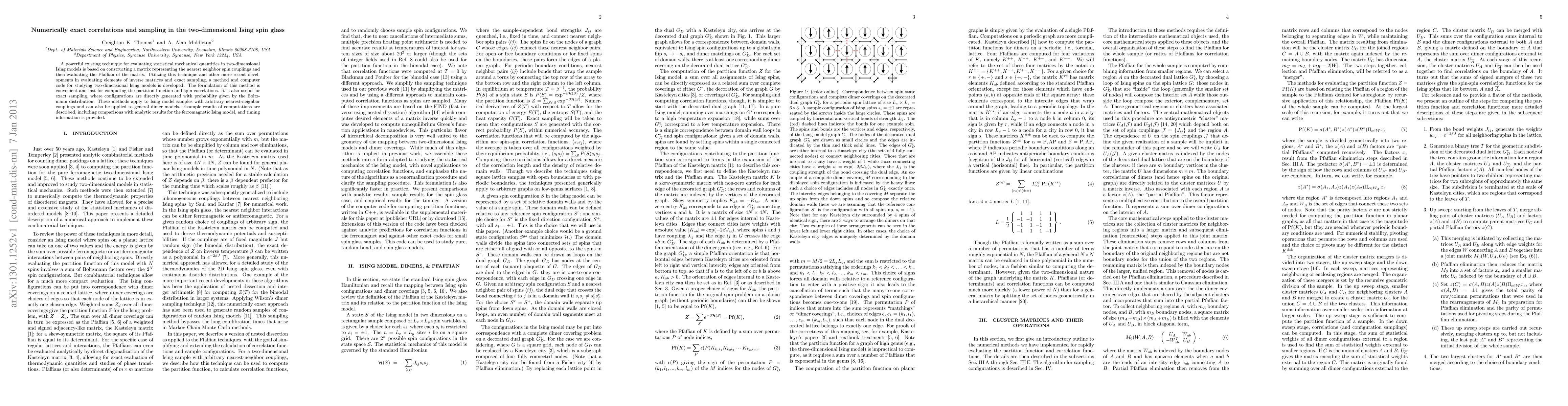This paper develops a fast numerical method for computing partition functions and spin correlations in two-dimensional Ising spin glass models using matrix techniques and exact sampling. The method is efficient for generating configurations according to the Boltzmann distribution and applies to models with arbitrary couplings and general dimer models.