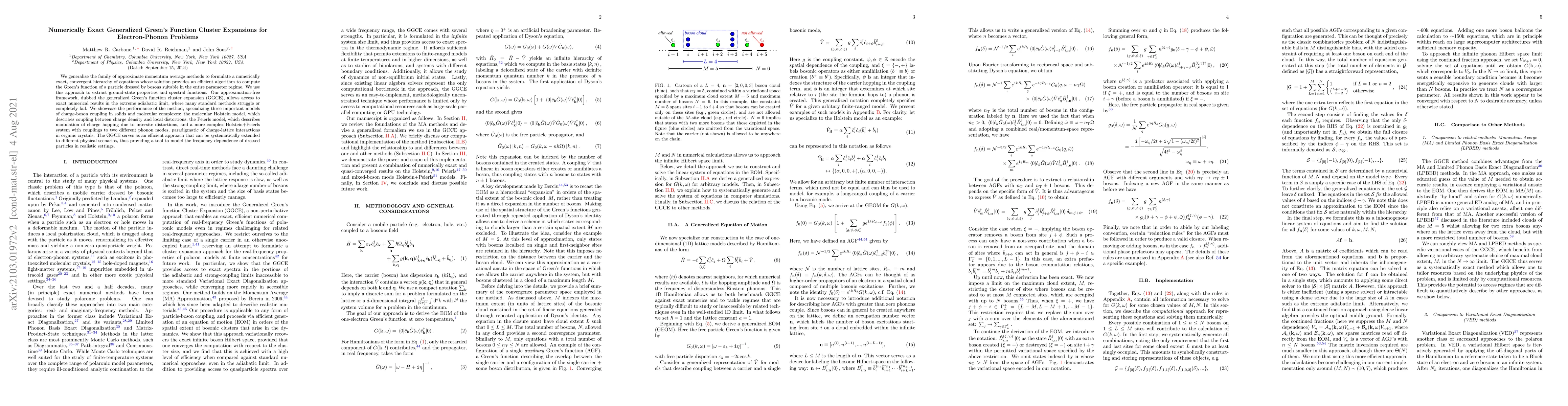 We generalize the family of approximate momentum average methods to formulate a numerically exact, convergent hierarchy of equations whose solution provides an efficient algorithm to compute the Green's function of a particle dressed by bosons suitable in the entire parameter regime. We use this approach to extract ground-state properties and spectral functions. Our approximation-free framework, dubbed the generalized Green's function cluster expansion (GGCE), allows access to exact numerical results in the extreme adiabatic limit, where many standard methods struggle or completely fail. We showcase the performance of the method, specializing three important models of charge-boson coupling in solids and molecular complexes: the molecular Holstein model, which describes coupling between charge density and local distortions, the Peierls model, which describes modulation of charge hopping due to intersite distortions, and a more complex Holstein+Peierls system with couplings to two different phonon modes, paradigmatic of charge-lattice interactions in organic crystals. The GGCE serves as an efficient approach that can be systematically extended to different physical scenarios, thus providing a tool to model the frequency dependence of dressed particles in realistic settings.
