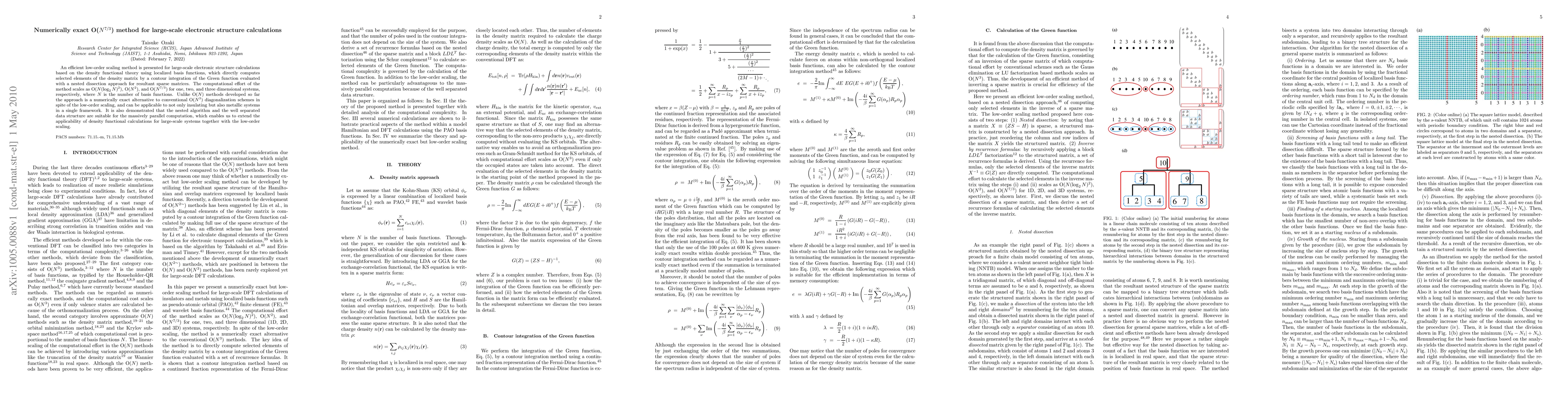 This paper introduces a numerically exact O($N^{7/3}$) method for large-scale electronic structure calculations based on density functional theory, employing localized basis functions and contour integration of the Green function. The method scales efficiently for one, two, and three-dimensional systems, and is suitable for both insulating and metallic systems, while also being well-suited for massively parallel computation.