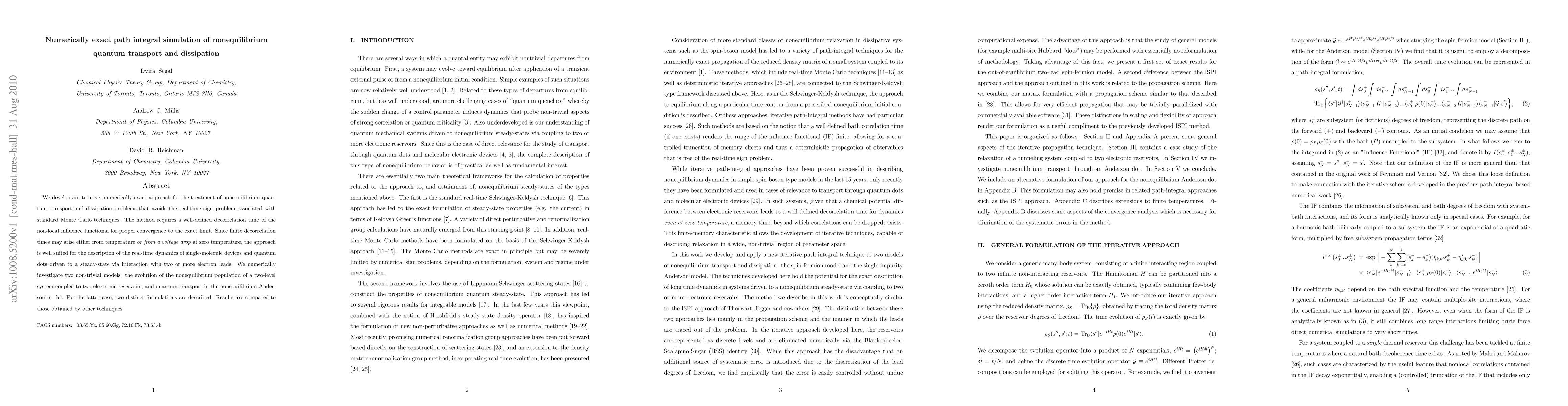 This paper presents a numerically exact iterative method for simulating nonequilibrium quantum transport and dissipation, circumventing the real-time sign problem in Monte Carlo simulations. The method is applied to two models, demonstrating its effectiveness in describing the dynamics of single-molecule devices and quantum dots.