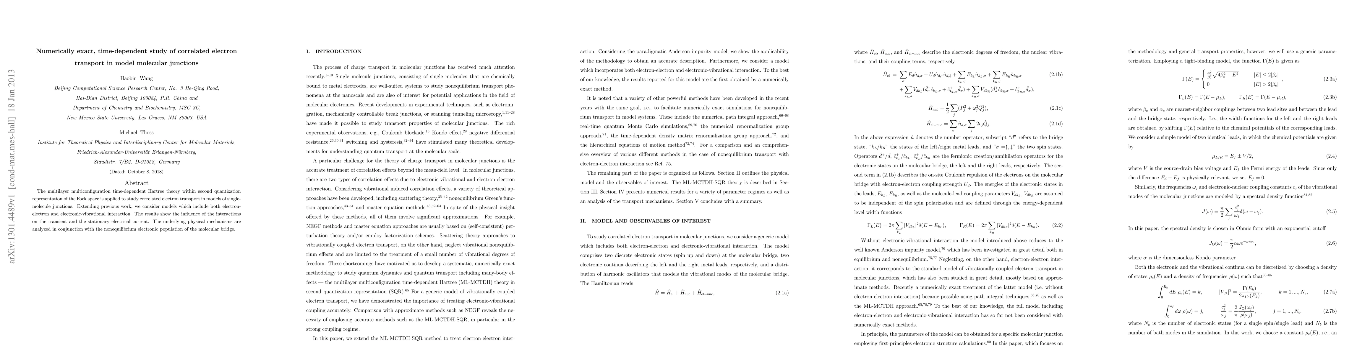 This study employs multilayer multiconfiguration time-dependent Hartree theory to examine correlated electron transport in single-molecule junctions, considering both electron-electron and electronic-vibrational interactions, and reveals their impact on transient and stationary electrical current. The analysis includes the nonequilibrium electronic population dynamics of the molecular bridge.