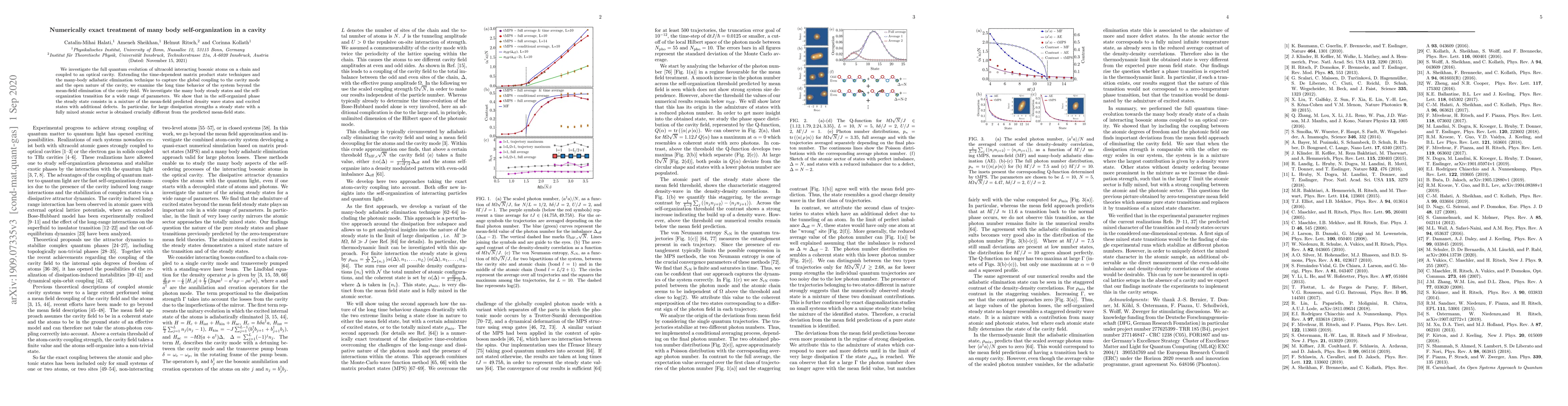 We investigate the full quantum evolution of ultracold interacting bosonic atoms on a chain and coupled to an optical cavity. Extending the time-dependent matrix product state techniques and the many-body adiabatic elimination technique to capture the global coupling to the cavity mode and the open nature of the cavity, we examine the long time behavior of the system beyond the mean-field elimination of the cavity field. We investigate the many body steady states and the self-organization transition for a wide range of parameters. We show that in the self-organized phase the steady state consists in a mixture of the mean-field predicted density wave states and excited states with additional defects. In particular, for large dissipation strengths a steady state with a fully mixed atomic sector is obtained crucially different from the predicted mean-field state.