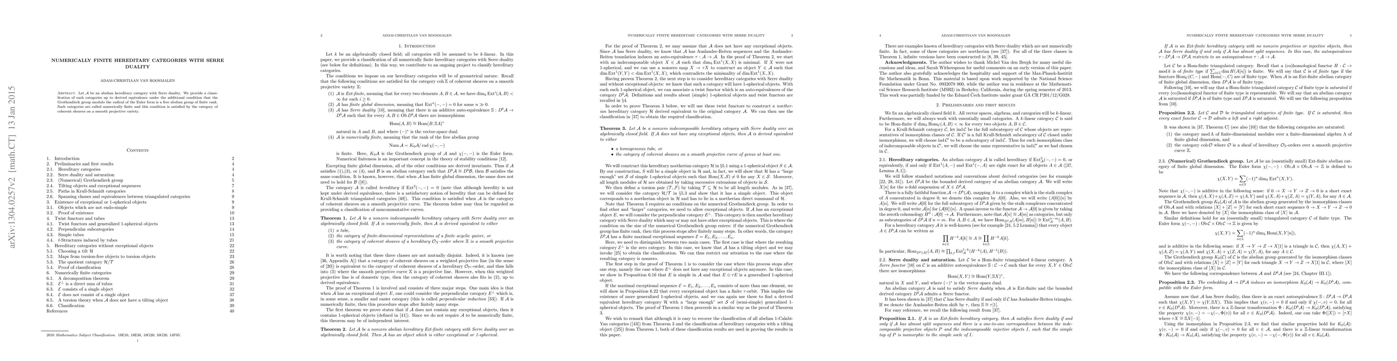 This paper classifies abelian hereditary categories with Serre duality that are numerically finite, where the Grothendieck group modulo the radical of the Euler form is a free abelian group of finite rank, and explores their derived equivalence. The focus is on categories like coherent sheaves on smooth projective varieties.