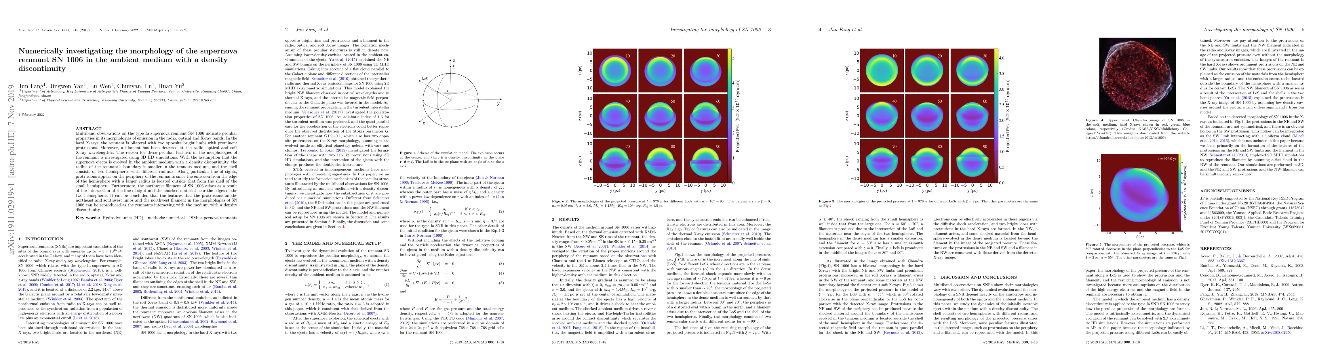This paper investigates the peculiar morphologies of the supernova remnant SN 1006 using 3D hydrodynamic simulations, finding that a density discontinuity in the ambient medium explains the remnant's bilateral structure, protrusions, and northwest filament. The simulations show that the remnant's boundary is smaller in the tenuous medium and consists of two hemispheres with different radii, leading to the observed features.