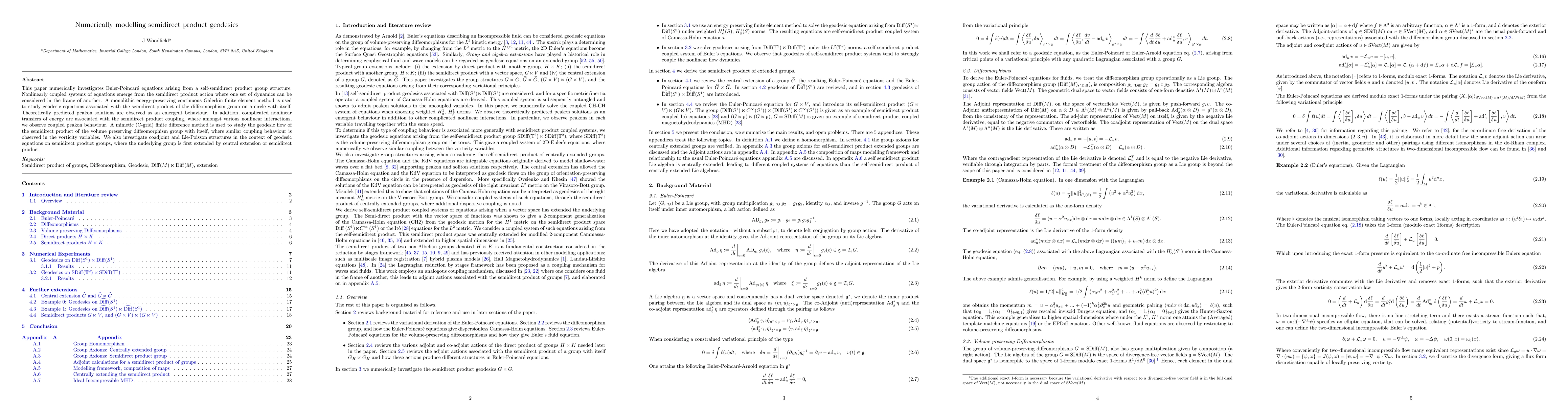This paper numerically models geodesics in semidirect product groups using Euler-Poincaré equations, observing peakon solutions and complex energy transfers through energy-preserving methods and finite difference techniques. It also explores coadjoint and Lie-Poisson structures in the context of these semidirect product groups.