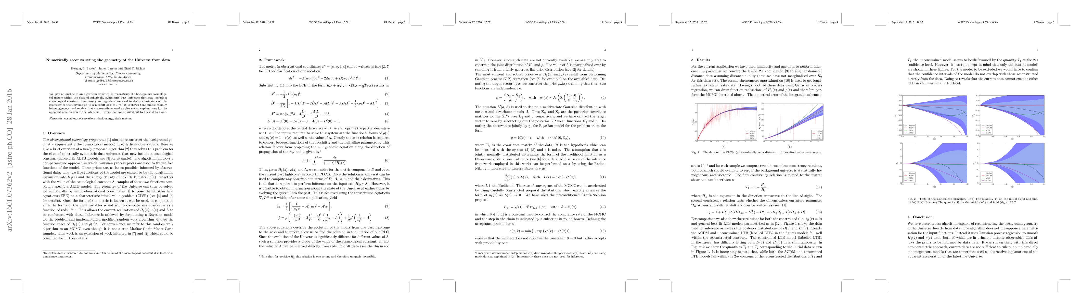 We give an outline of an algorithm designed to reconstruct the background cosmological metric within the class of spherically symmetric dust universes that may include a cosmological constant. Luminosity and age data are used to derive constraints on the geometry of the universe up to a redshift of $z = 1.75$. It is shown that simple radially inhomogeneous void models that are sometimes used as alternative explanations for the apparent acceleration of the late time Universe cannot be ruled out by these data alone.