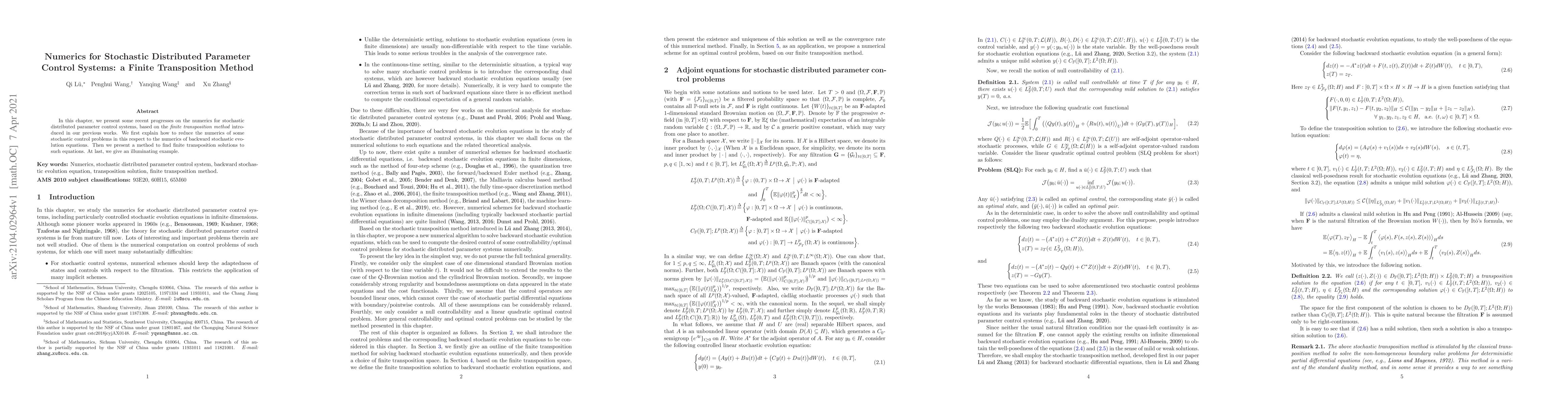 In this chapter, we present some recent progresses on the numerics for stochastic distributed parameter control systems, based on the \emph{finite transposition method} introduced in our previous works. We first explain how to reduce the numerics of some stochastic control problems in this respect to the numerics of backward stochastic evolution equations. Then we present a method to find finite transposition solutions to such equations. At last, we give an illuminating example.