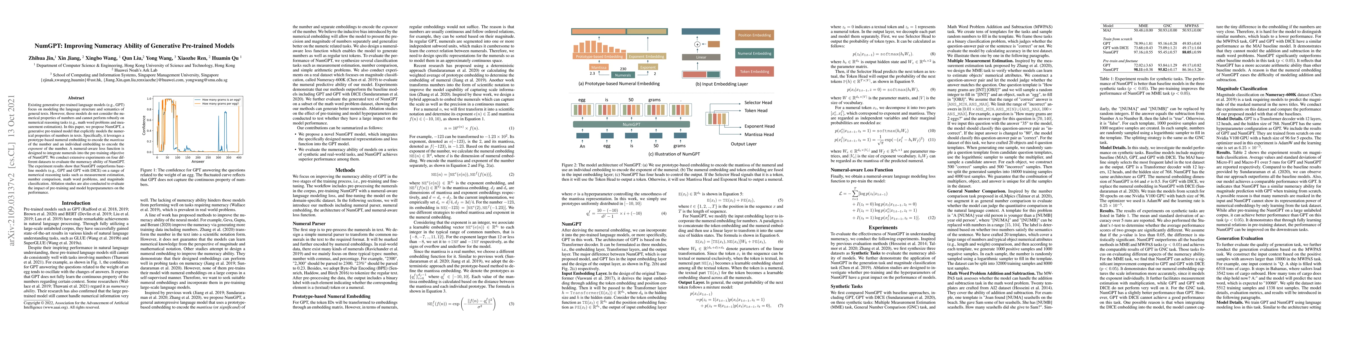 NumGPT enhances generative pre-trained models' numeracy by explicitly modeling numerical properties through prototype-based numeral and exponent embeddings, achieving superior performance on numerical reasoning tasks compared to baseline models. Extensive experiments and ablation studies validate its effectiveness.