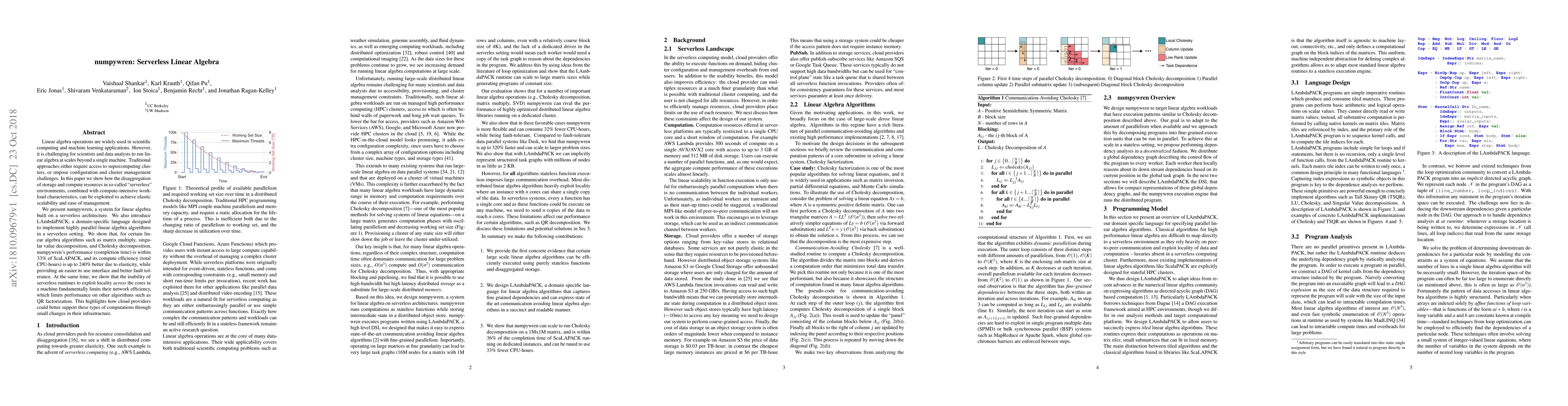 Numpywren is a serverless system designed for scalable linear algebra operations, leveraging serverless architecture for elastic scalability and ease of management. It employs LAmbdaPACK for parallel algorithm implementation, achieving competitive performance and efficiency for certain algorithms while highlighting limitations in network efficiency for others.