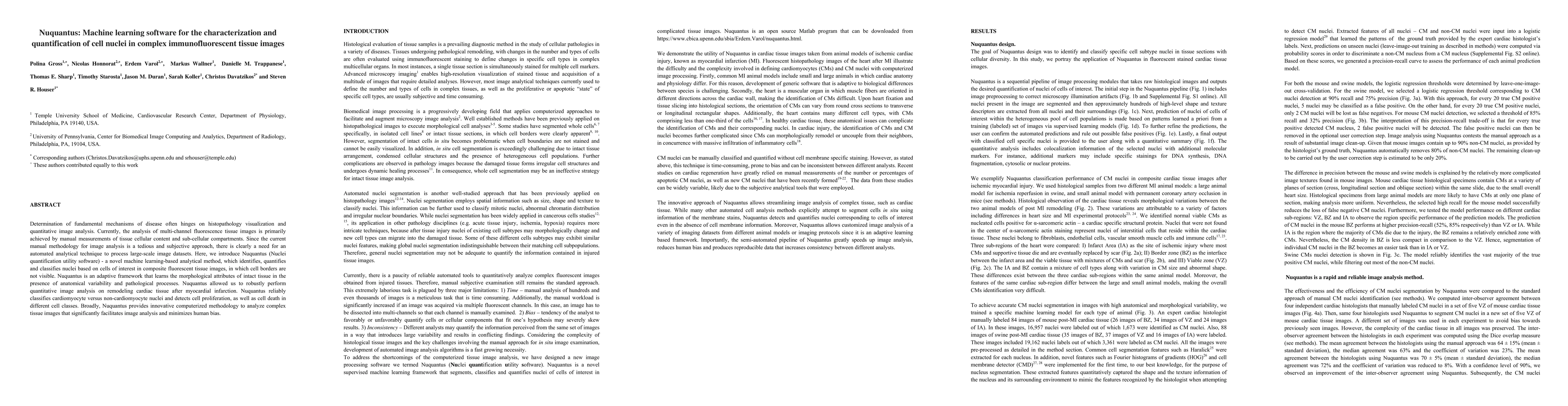 Determination of fundamental mechanisms of disease often hinges on histopathology visualization and quantitative image analysis. Currently, the analysis of multi-channel fluorescence tissue images is primarily achieved by manual measurements of tissue cellular content and sub-cellular compartments. Since the current manual methodology for image analysis is a tedious and subjective approach, there is clearly a need for an automated analytical technique to process large-scale image datasets. Here, we introduce Nuquantus (Nuclei quantification utility software) - a novel machine learning-based analytical method, which identifies, quantifies and classifies nuclei based on cells of interest in composite fluorescent tissue images, in which cell borders are not visible. Nuquantus is an adaptive framework that learns the morphological attributes of intact tissue in the presence of anatomical variability and pathological processes. Nuquantus allowed us to robustly perform quantitative image analysis on remodeling cardiac tissue after myocardial infarction. Nuquantus reliably classifies cardiomyocyte versus non-cardiomyocyte nuclei and detects cell proliferation, as well as cell death in different cell classes. Broadly, Nuquantus provides innovative computerized methodology to analyze complex tissue images that significantly facilitates image analysis and minimizes human bias.